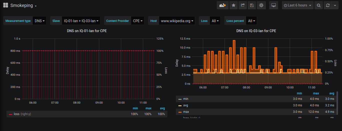 The screenshot shows measurements for the DNS probe for two slaves, measurement done asking the CPE for host www.wikipedia.org