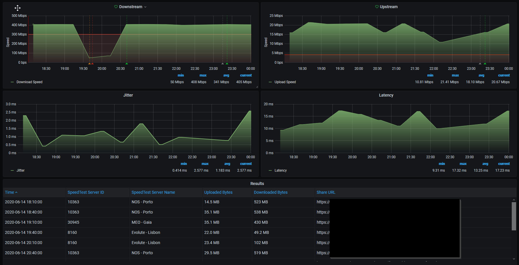 Dashboard for my Speedtest exporter. V2 has a results table with: - Time - Speedtest Server ID - Speedtest Server Name - Share URL - Uploaded and downloaded bytes