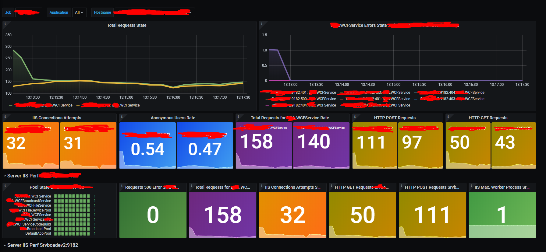 This dashboard is prepared for iis metrics. Tested and works with version 0.13.0 of windows_exporter. When installing it you must specify that you want IIS metrics included, they aren't by default. Since the services in IIS are different, there will be parts you need to update.