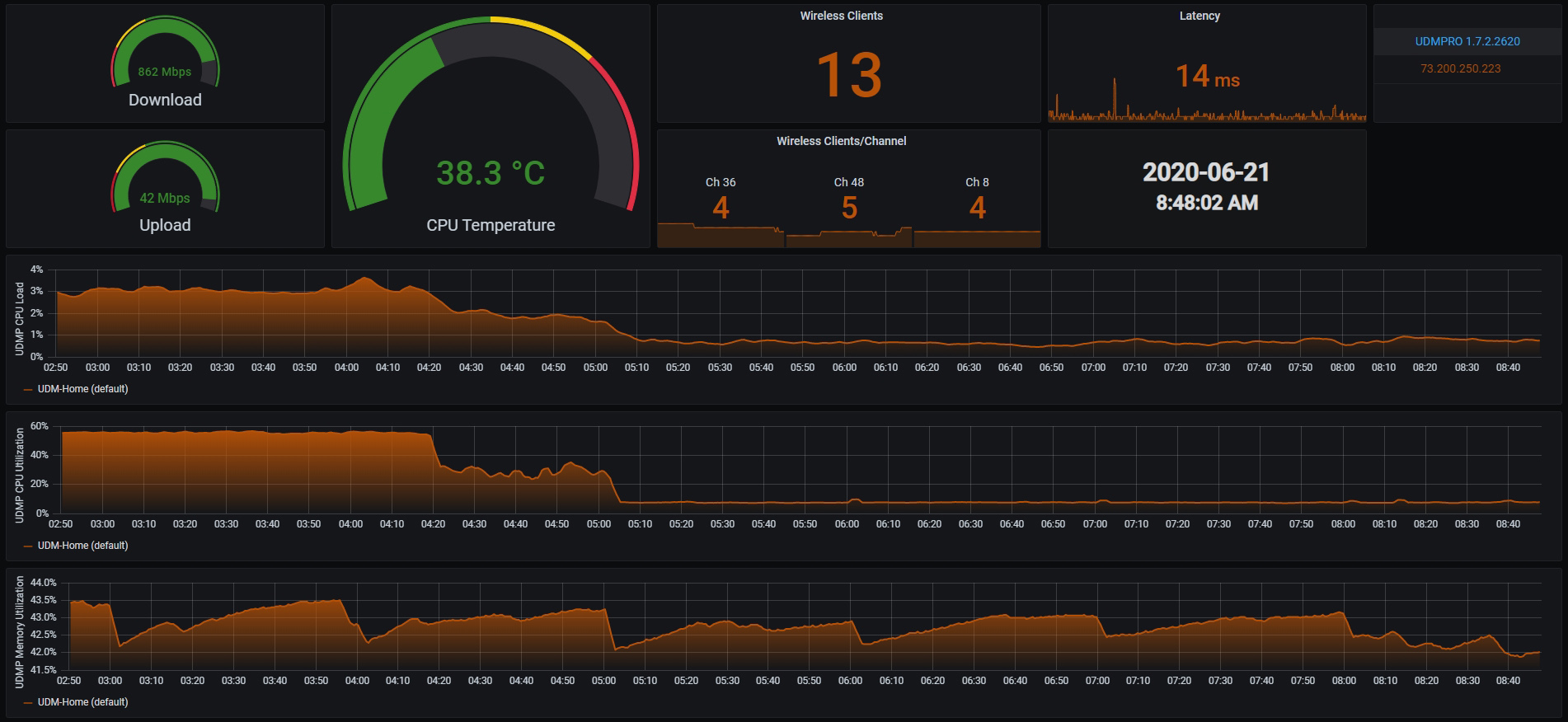 Utilized in conjunction with Unifi-Poller, this dashboard gives you the important metrics you want to see at a glance. Looking for suggestions or recommendations on things to add or change.