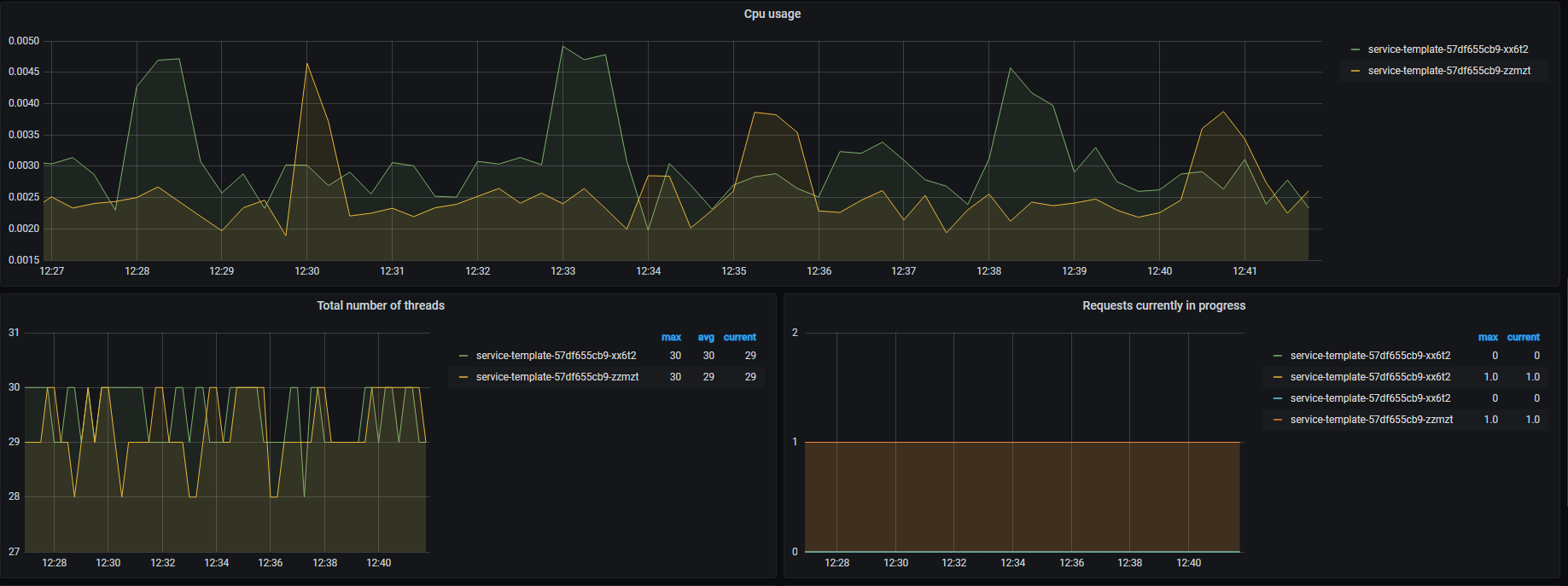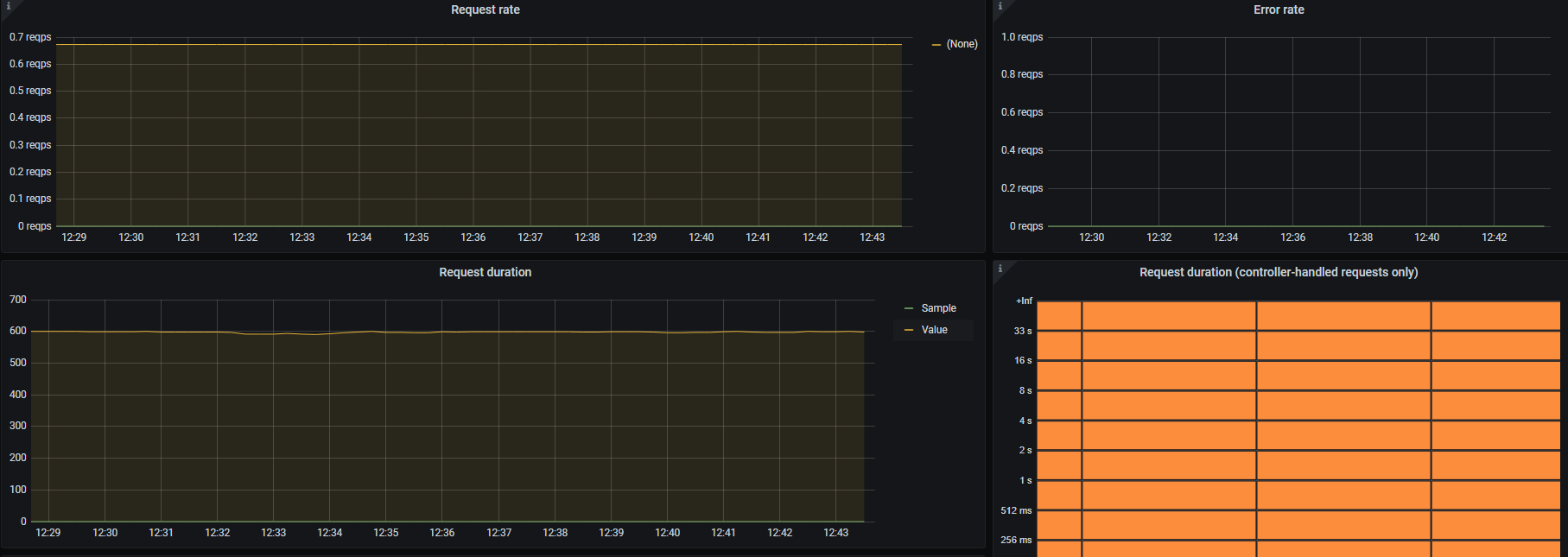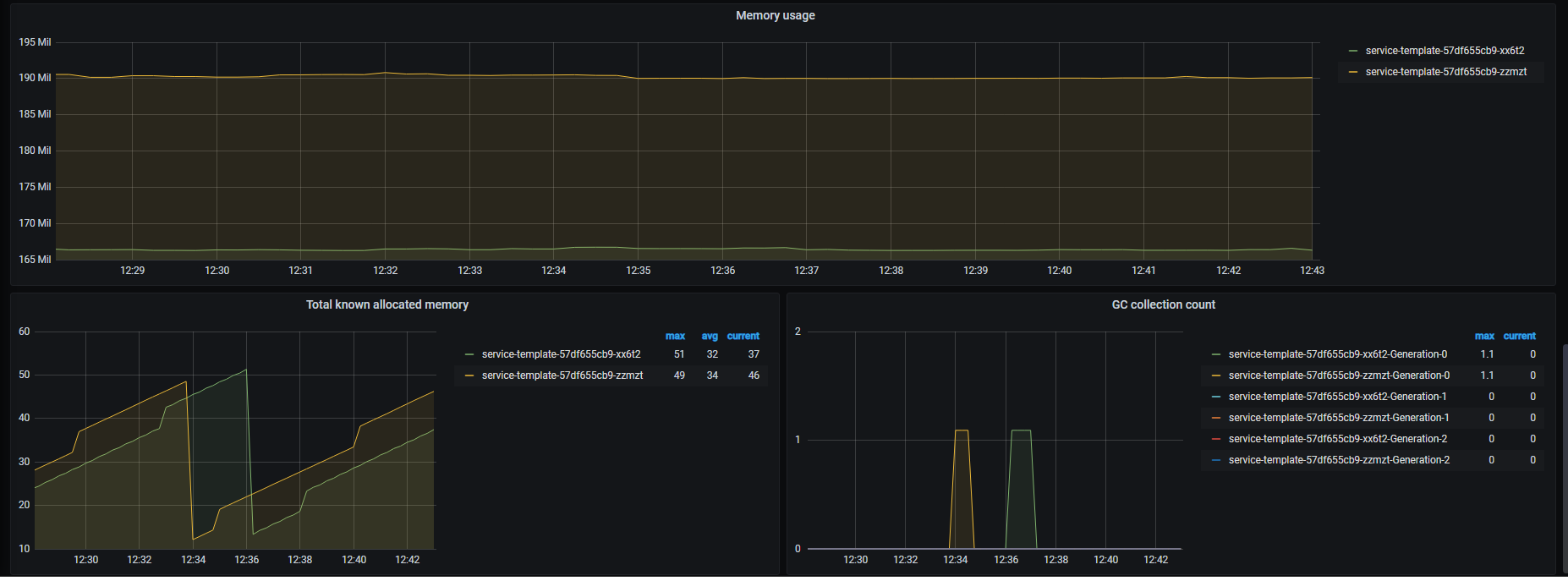 The Asp net core - Services dashboard uses the prometheus data source to create a Grafana dashboard with the graph and heatmap panels.