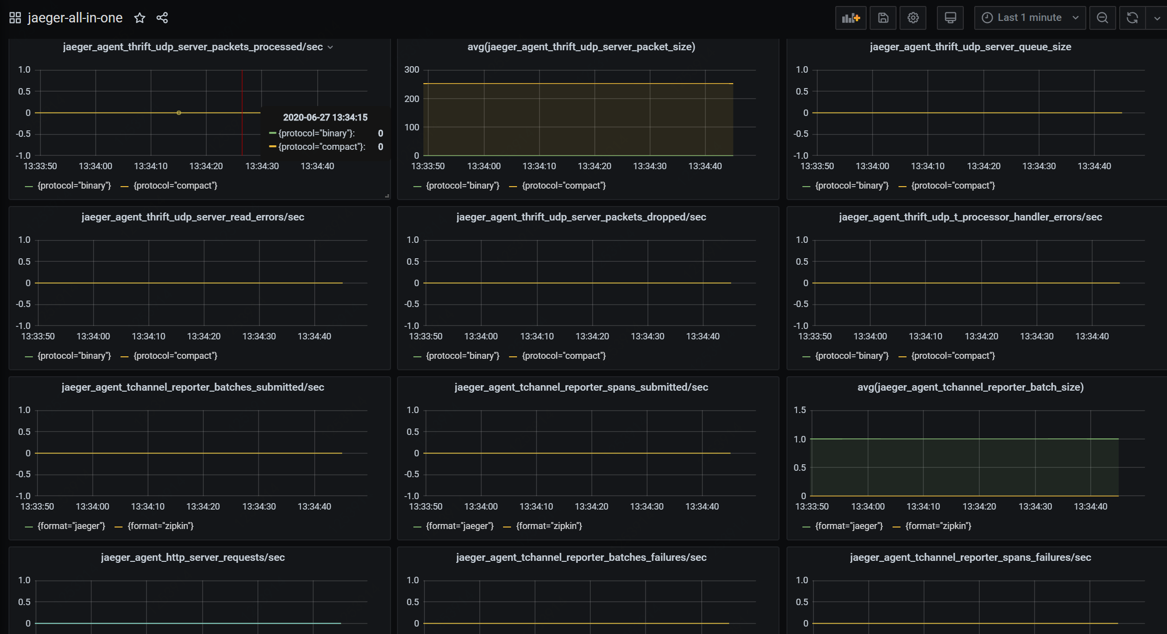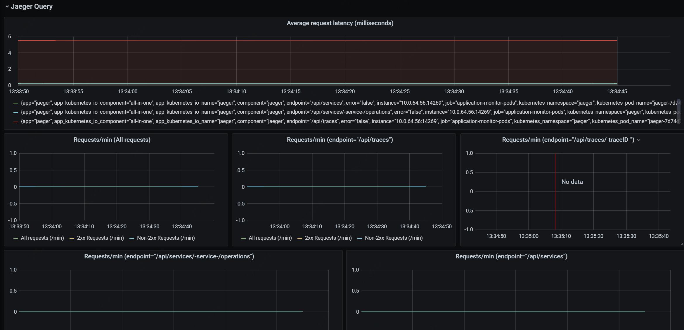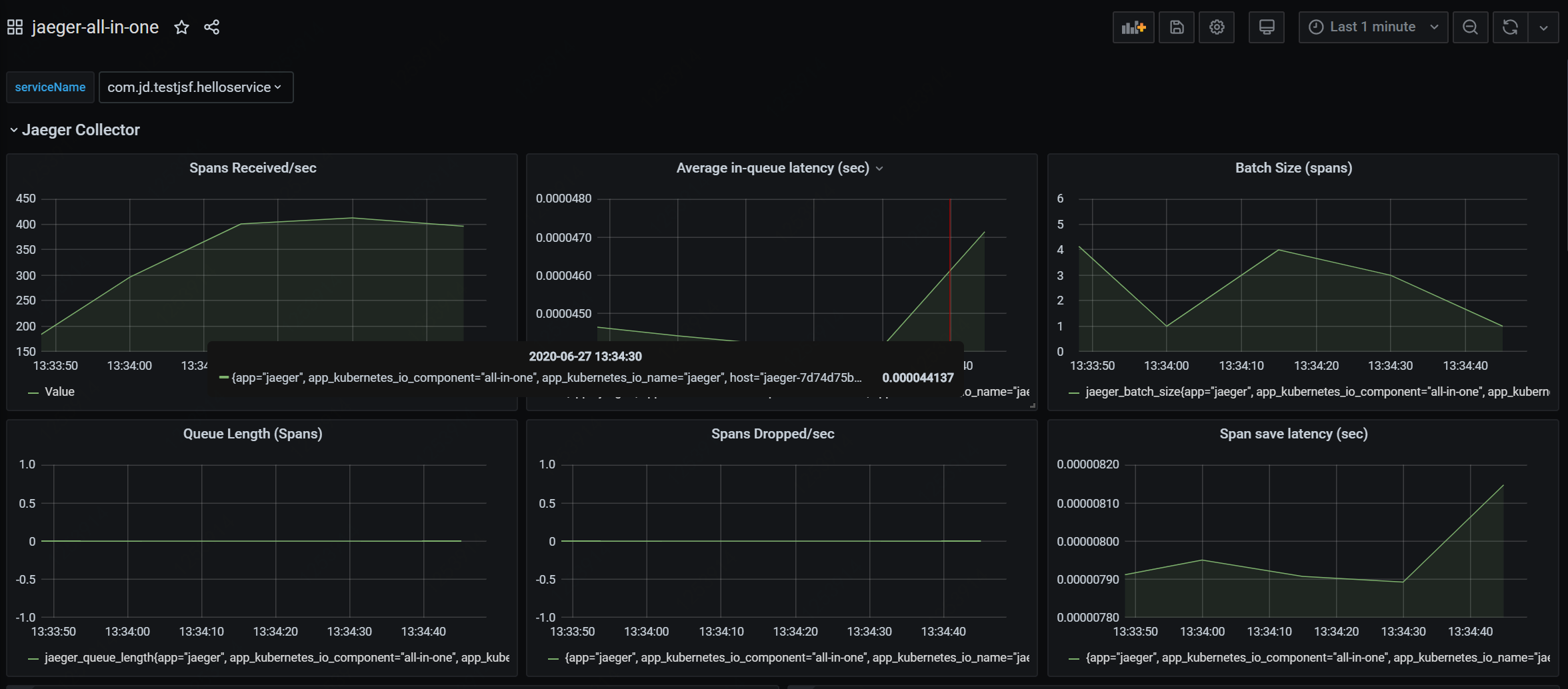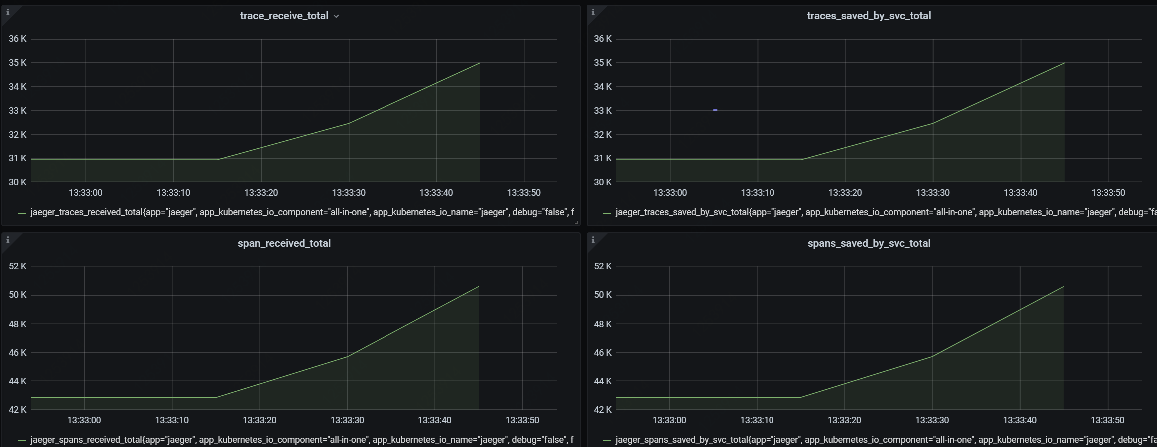 Dashboard for monitoring jaeger-all-in-one running in a k8s environment. Relying on the official mirror, four core monitoring indicators of Jaeger Collector are added.