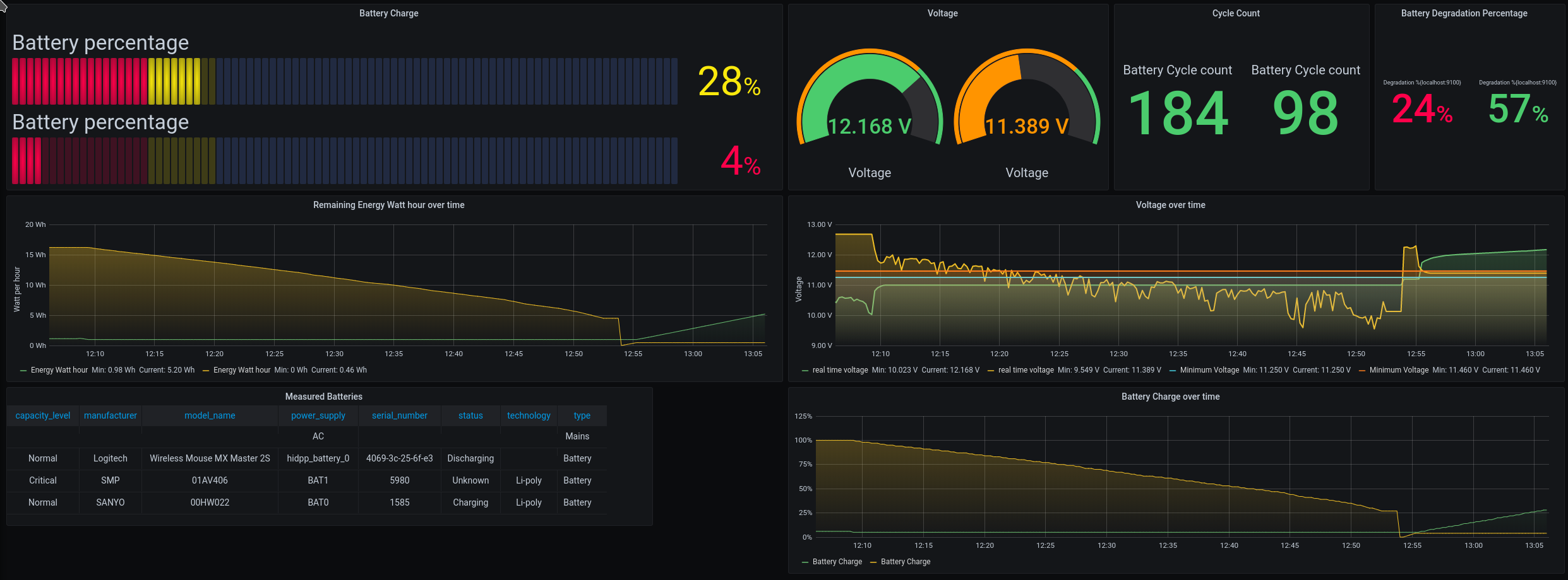 Power information for laptops All you need is node_exporter running. Power and battery stats are exposed by the kernel. Tested only on laptops running Linux.