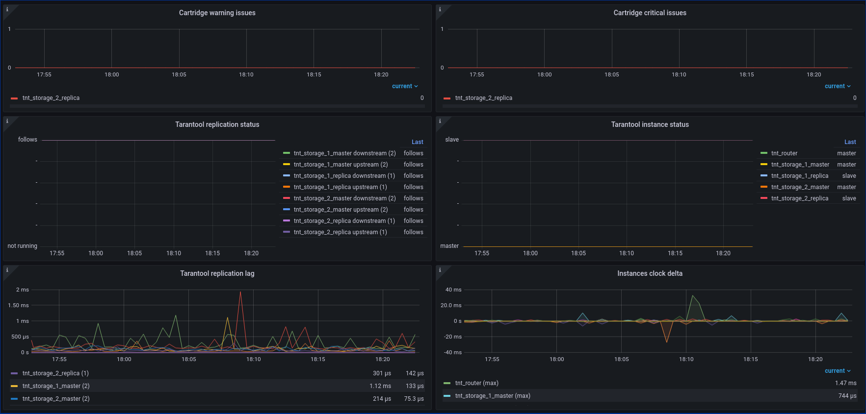 The dashboard is designed to work with Tarantool metrics module (v0.15.1 or newer is needed for complete experience). It is recommended to use metrics role (refer to cartridge.roles.metrics role page for instructions). Be sure to set alias for every Tarantool instance (e.g. by environment variable TARANTOOL_ALIAS) so metrics will be splitted and displayed correctly.