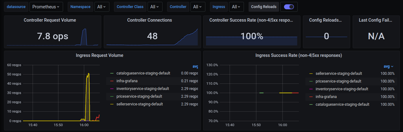 This Dashboard contains metrics visualization of Nginx Ingress Controller Running in Kubernetes Using Prometheus as Datasource. If you have prometheus and grafana installed on your cluster then prometheus will already be scraping this data due to the scrape annotation on the deployment.