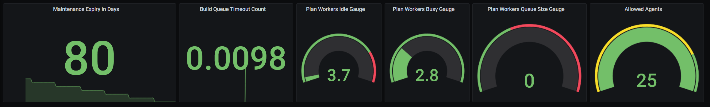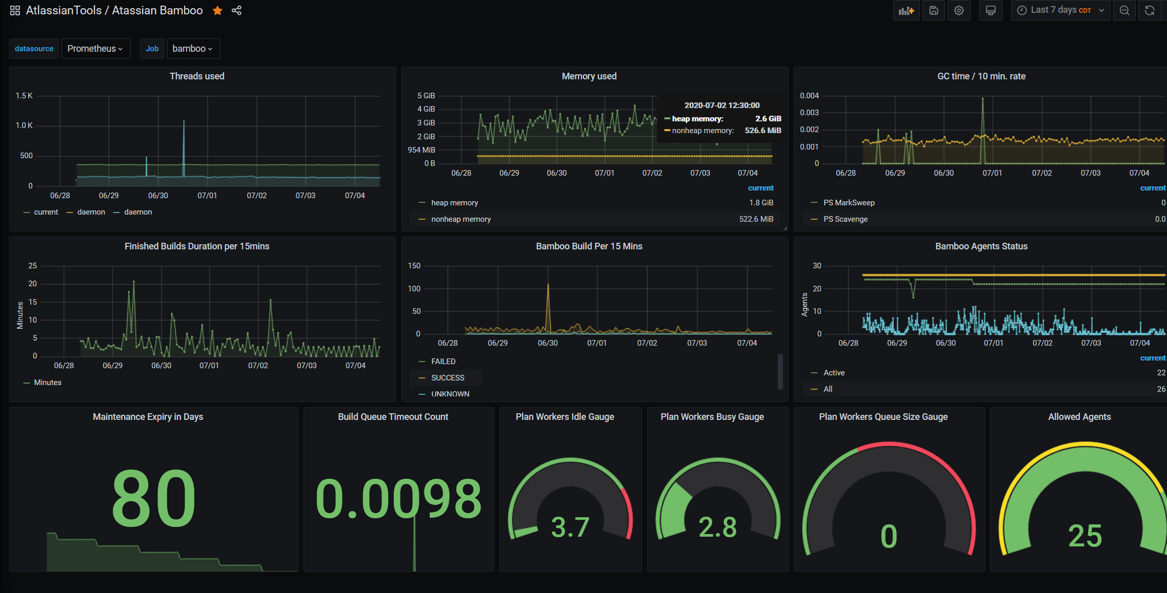This dashboard is for reading Atlassian Bamboo metrics in the easiest way. It has Below three stats that are very relative for our daily bamboo metrics monitoring.