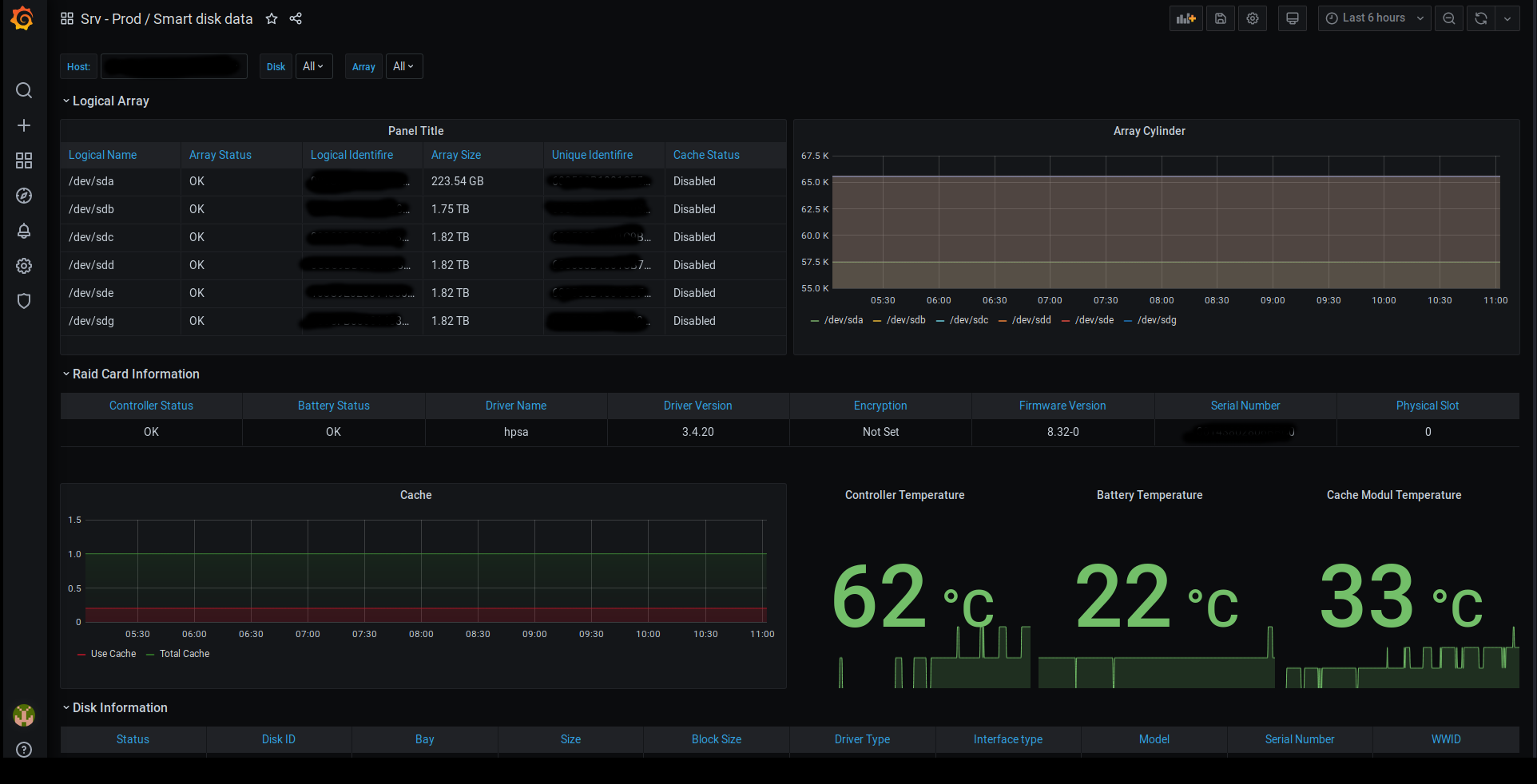 Show metric from HP raid controller and smartclt. Exporter: https://github.com/jakubjastrabik/smartctl_ssacli_exporter