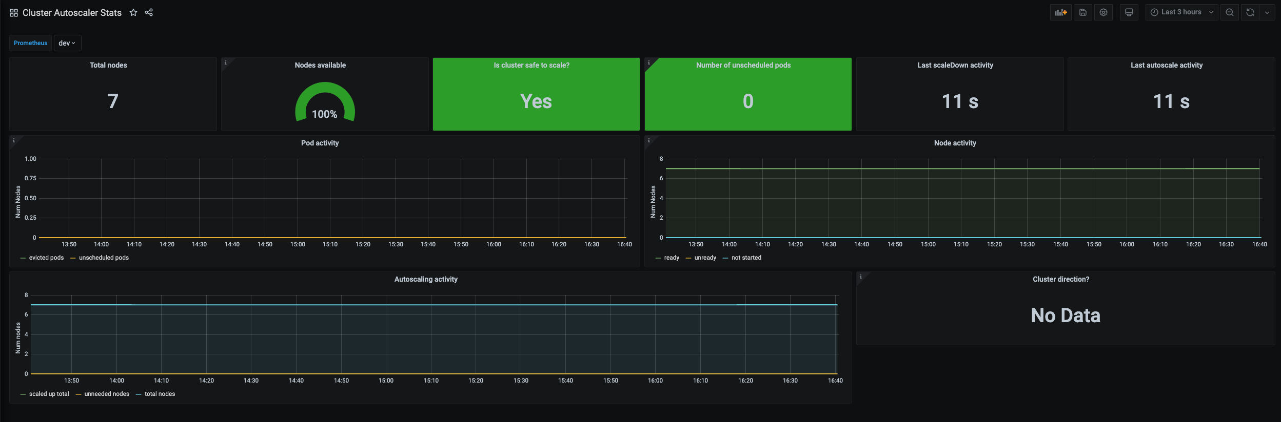 Super simple dashboard showing an overview of Kubernetes cluster autoscaling activity and status, using metrics reported by the autoscaler to Prometheus. Prometheus datasource can be chosen.