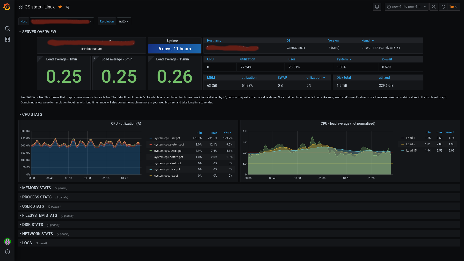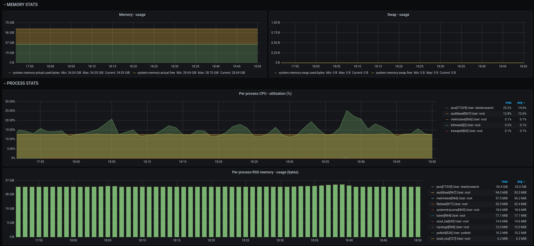 Presentation of OS metrics collected from Metricbeat. Also including logs for correlation with logs from filebeat.