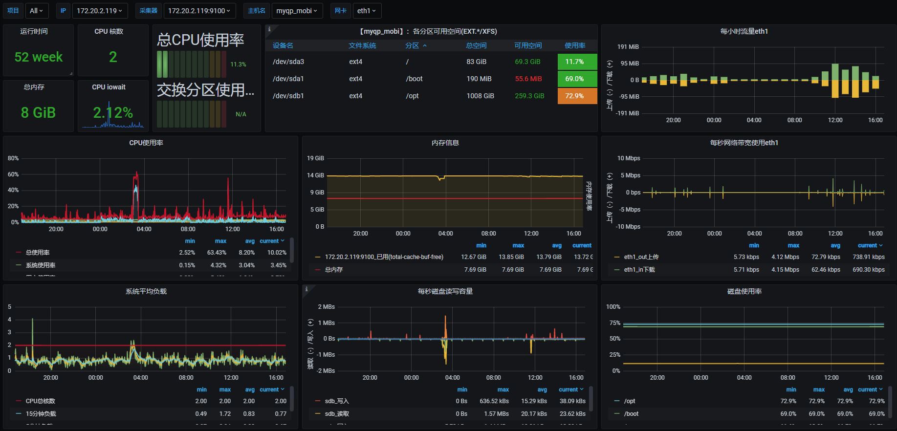 添加了个分区节点数查看。添加了个人使用的标签。如需修改,请大家修改原版:1 Node Exporter for Prometheus Dashboard CN v20200628 by StarsL.cn,https://grafana.com/grafana/dashboards/8919