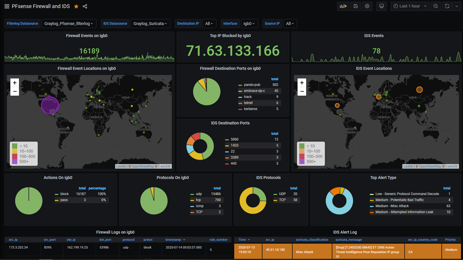 A pfSense dashboard that displays IDS (suricata) and Firewall events. Uses Graylog as the backend.