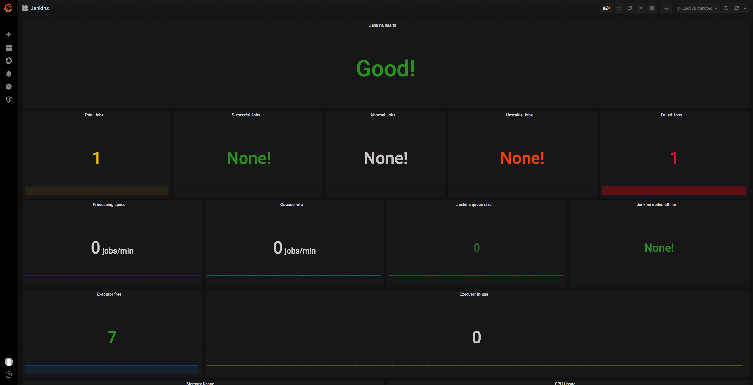 The Jenkins dashboard uses the prometheus data source to create a Grafana dashboard with the graph, singlestat and stat panels.