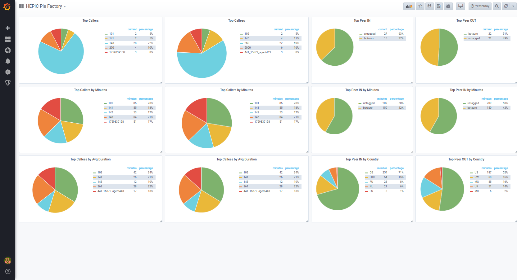 Provides Pie Factory for HEPIC Calls and Peer IN/OUT by number, minutes, average duration.