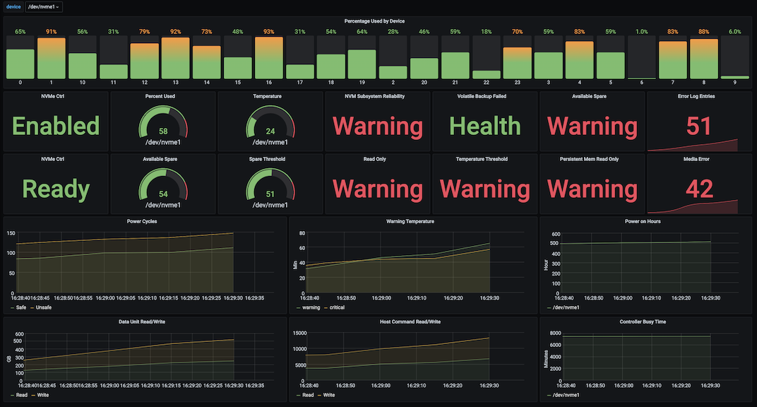 nvme_exporter provides useful metrics of NVMe SSDs (e.g., lifetime, device status, and read/write operations that are described in NVME specifications https://nvmexpress.org/). The information is obtained from NVMe Admin Commands using the NVMe CLI tool.