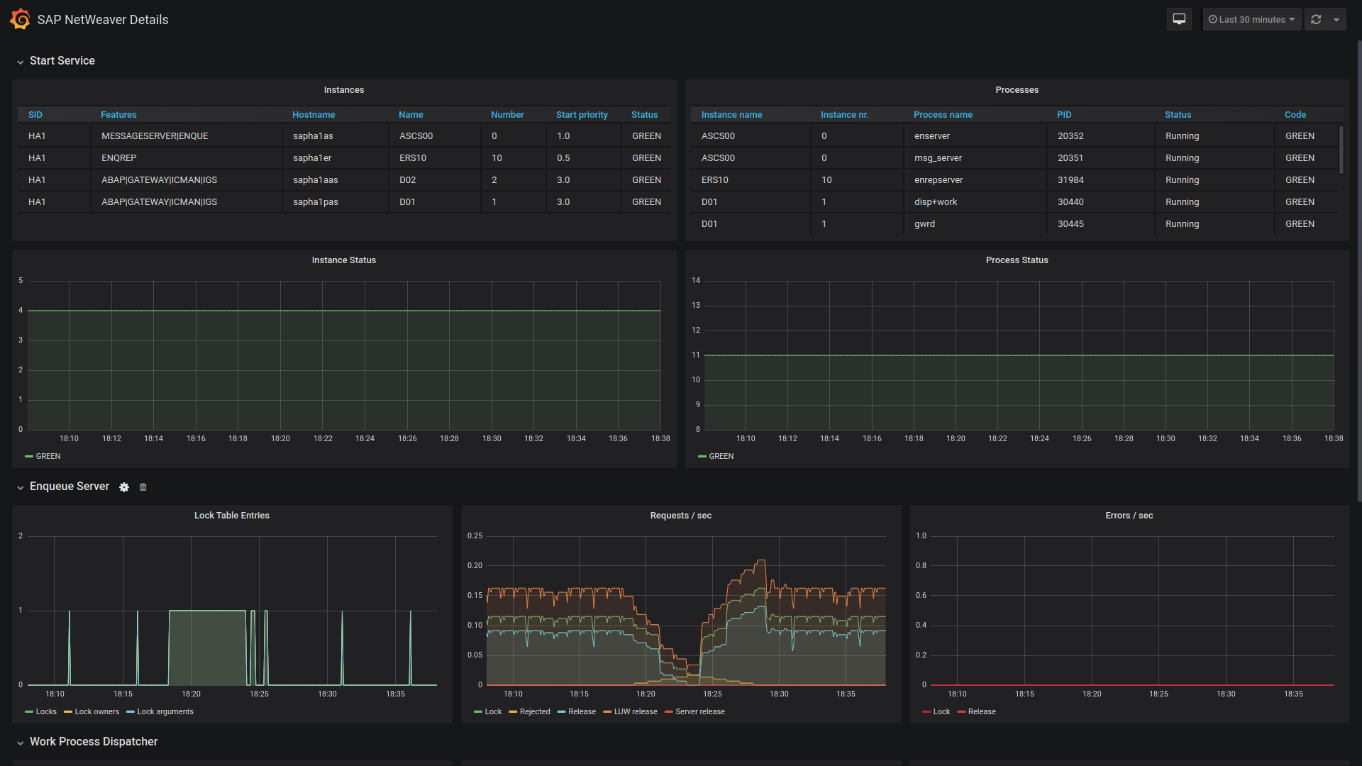 This dashboard shows stats of a SAP NetWeaver cluster; it is meant to be used with sap_host_exporter.