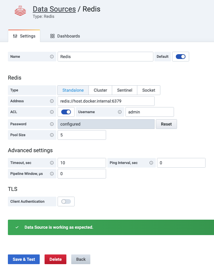 The Redis Data Source for Grafana is a plug-in that lets you connect to any Redis database, on-premises or in the cloud. You get out-of-the-box predefined dashboards, and you can build customized dashboards to monitor Redis and application data.