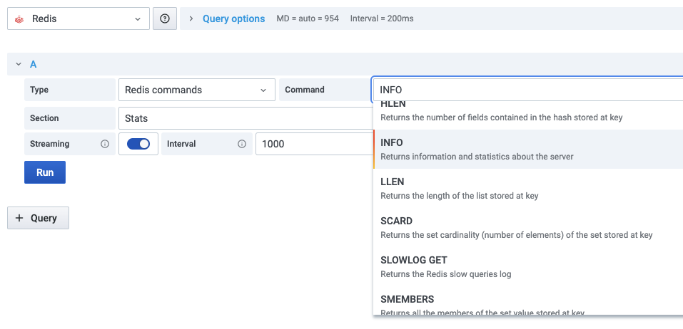 Requires Grafana 7.1+ with a new backend plug-in platform to the support the Redis Data Source for Grafana.