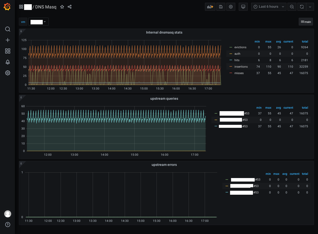 - Internal dnsmasq stats (evictions, hits, auth, insections and misses queries)