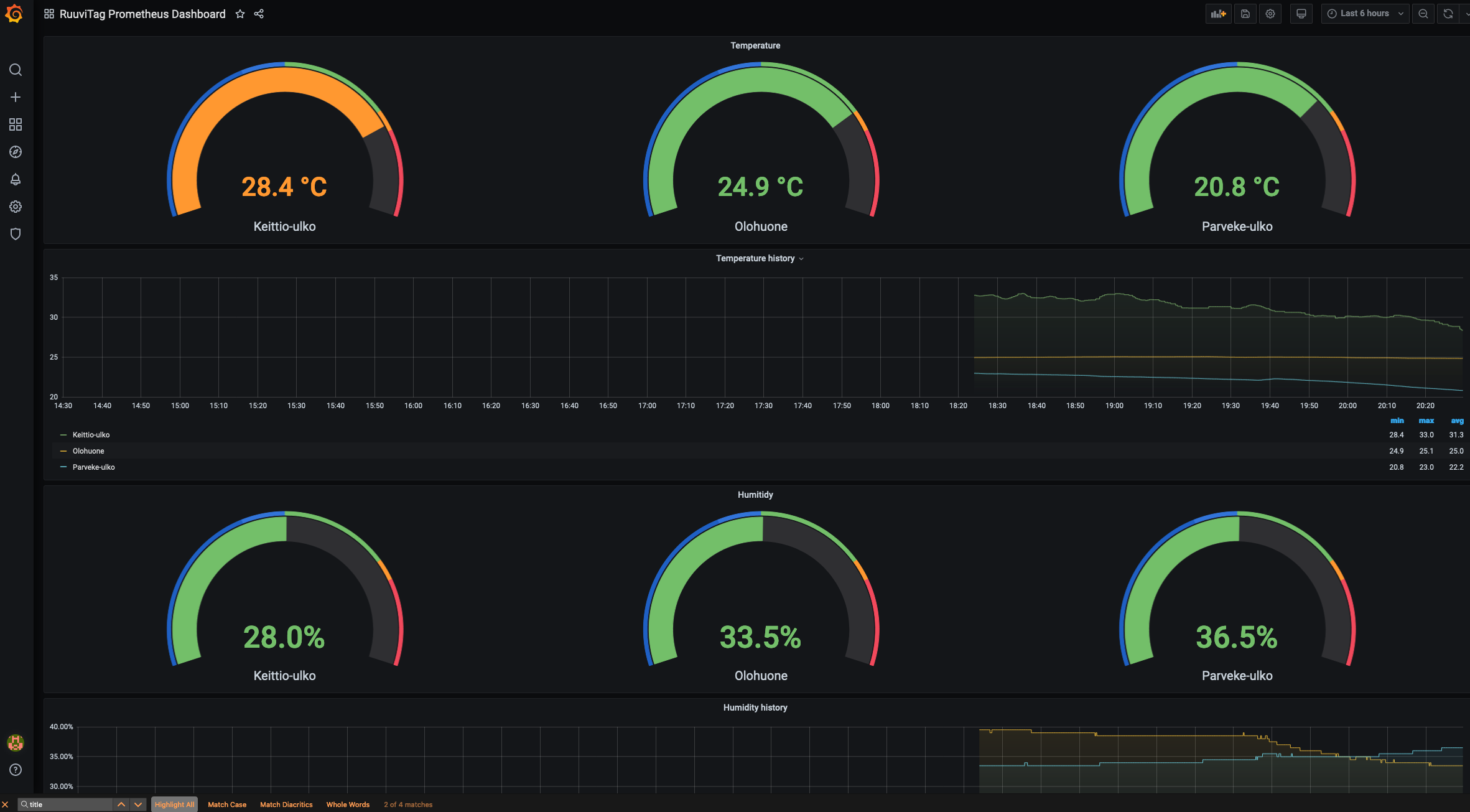 Simplistic dashboard for RaspberryPi RuuviTag prometheus exporter: https://github.com/arimkevi/ruuvi-prometheus-scraper