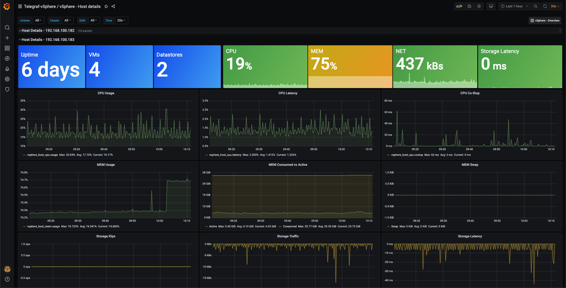 This dashboard gives details of VMware vSphere ESXi hosts. Data is pulled from vCenter with the vSphere plugin of the Telegraf agent. The data is stored in an InfluxDB timeseries database.