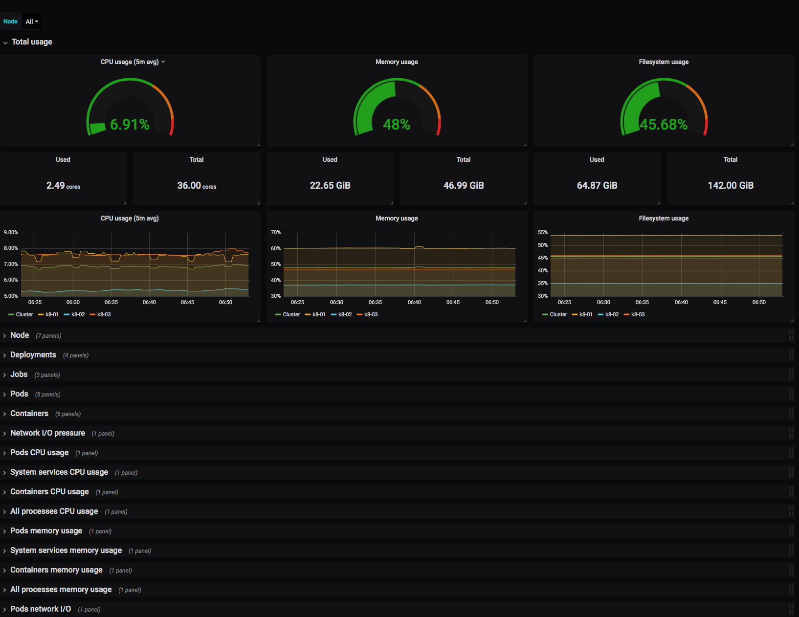 Monitors Kubernetes cluster using Prometheus. Shows overall cluster or Node CPU / Memory / Filesystem usage as well as individual pod, containers, systemd services statistics. Uses cAdvisor metrics only.