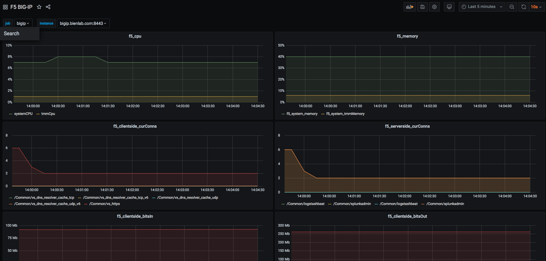 The F5 BIG-IP dashboard uses the prometheus data source to create a Grafana dashboard with the graph panel.