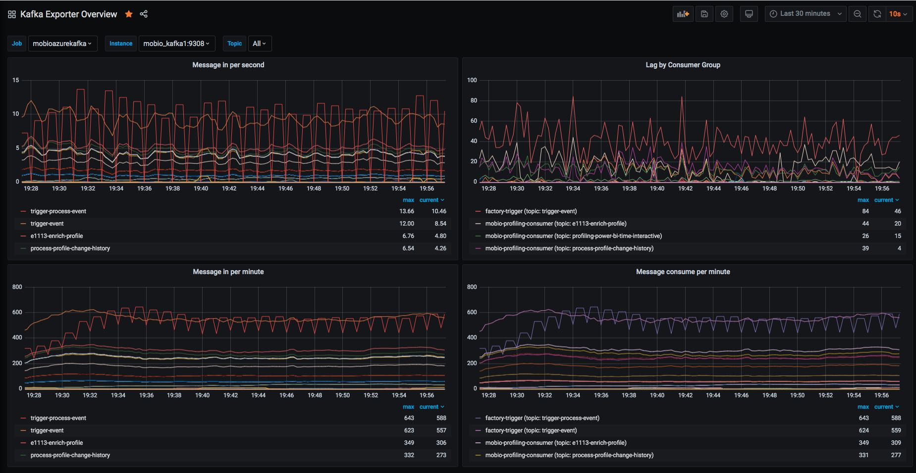The Kafka Exporter Overview dashboard uses the prometheus data source to create a Grafana dashboard with the graph panel.