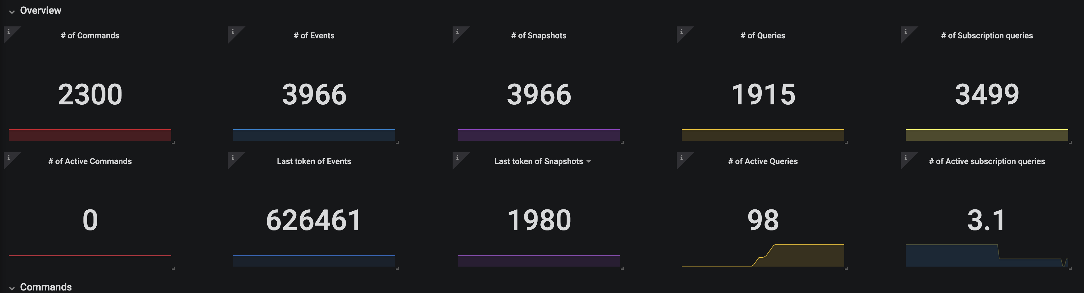 Axon Server Dashboard - Includes metrics of interest like commands, queries, bounded queues, grpc metrics etc... Filter metrics by node or by context.