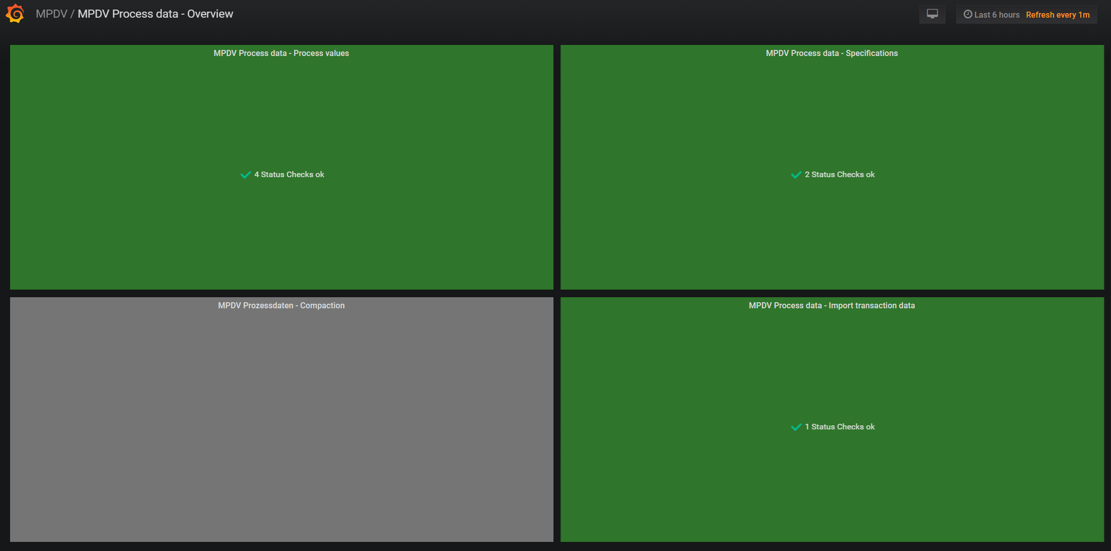 The MPDV Process data - Overview dashboard uses the prometheus data source to create a Grafana dashboard with the blackmirror1-statusbygroup-panel panel.