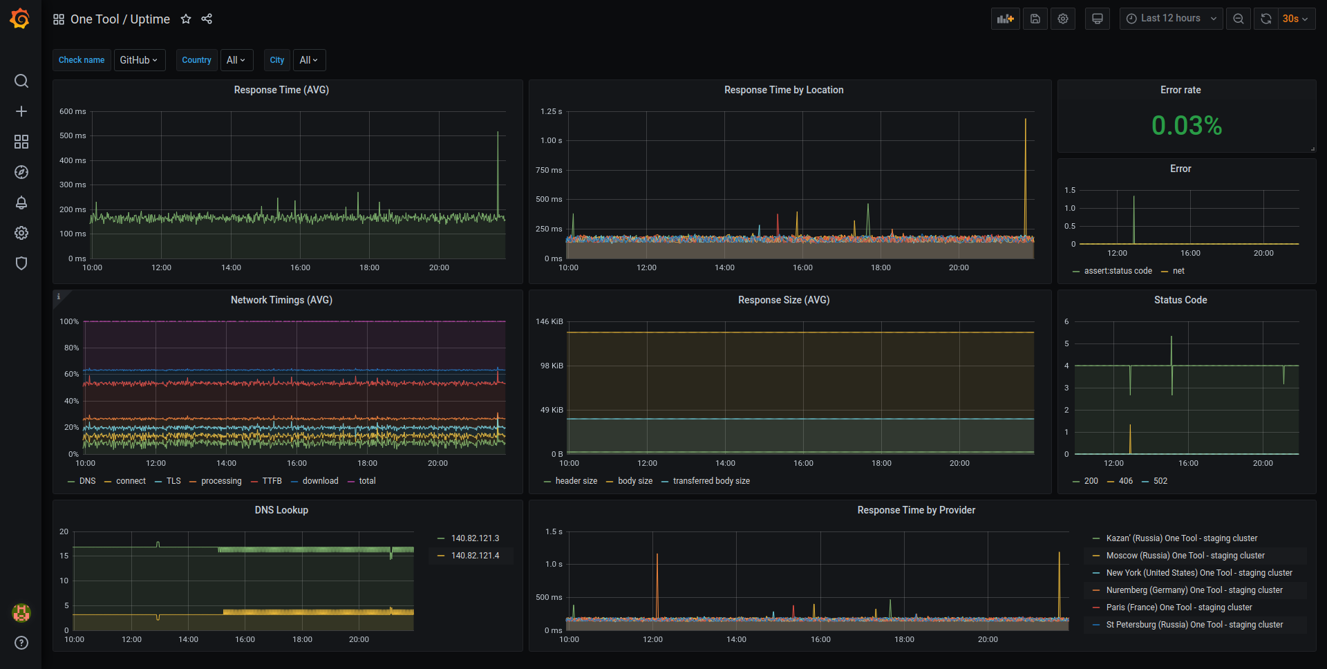 The Uptime dashboard uses the prometheus data source to create a Grafana dashboard with the graph and singlestat panels.
