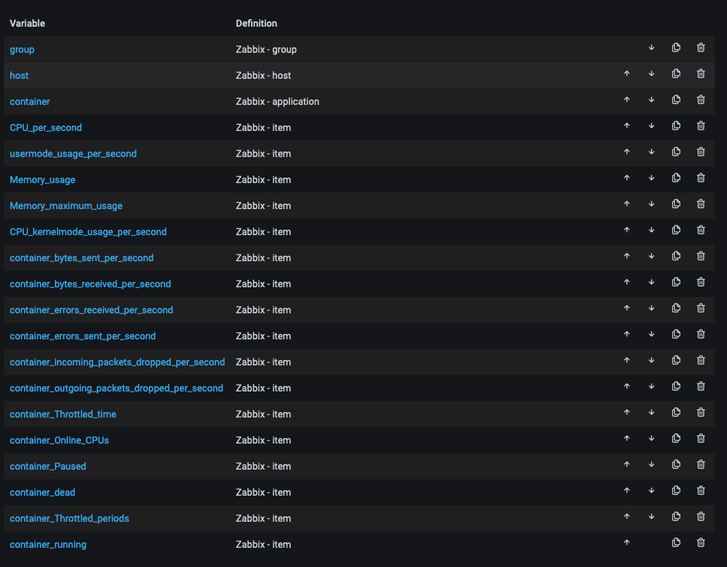 This dashboard enabled the use of zabbix as a datasource for Docker metrics, in order to use this data source you will need to install the Zabbix plugin for Grafana