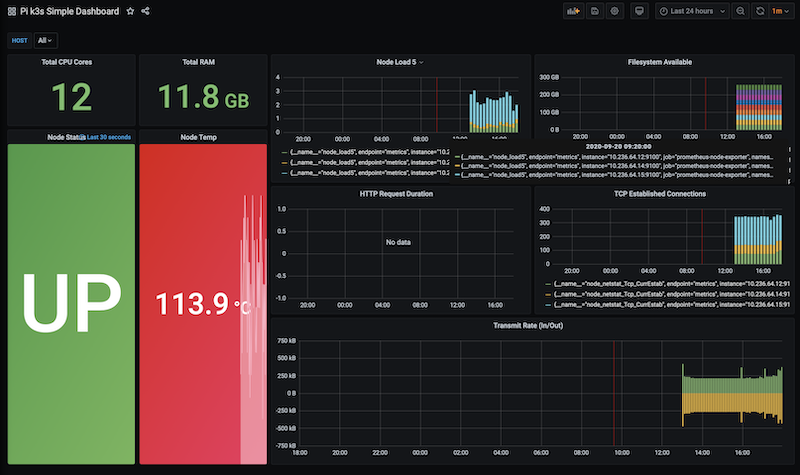The Pi k3s Simple Dashboard dashboard uses the prometheus data source to create a Grafana dashboard with the graph and stat panels.