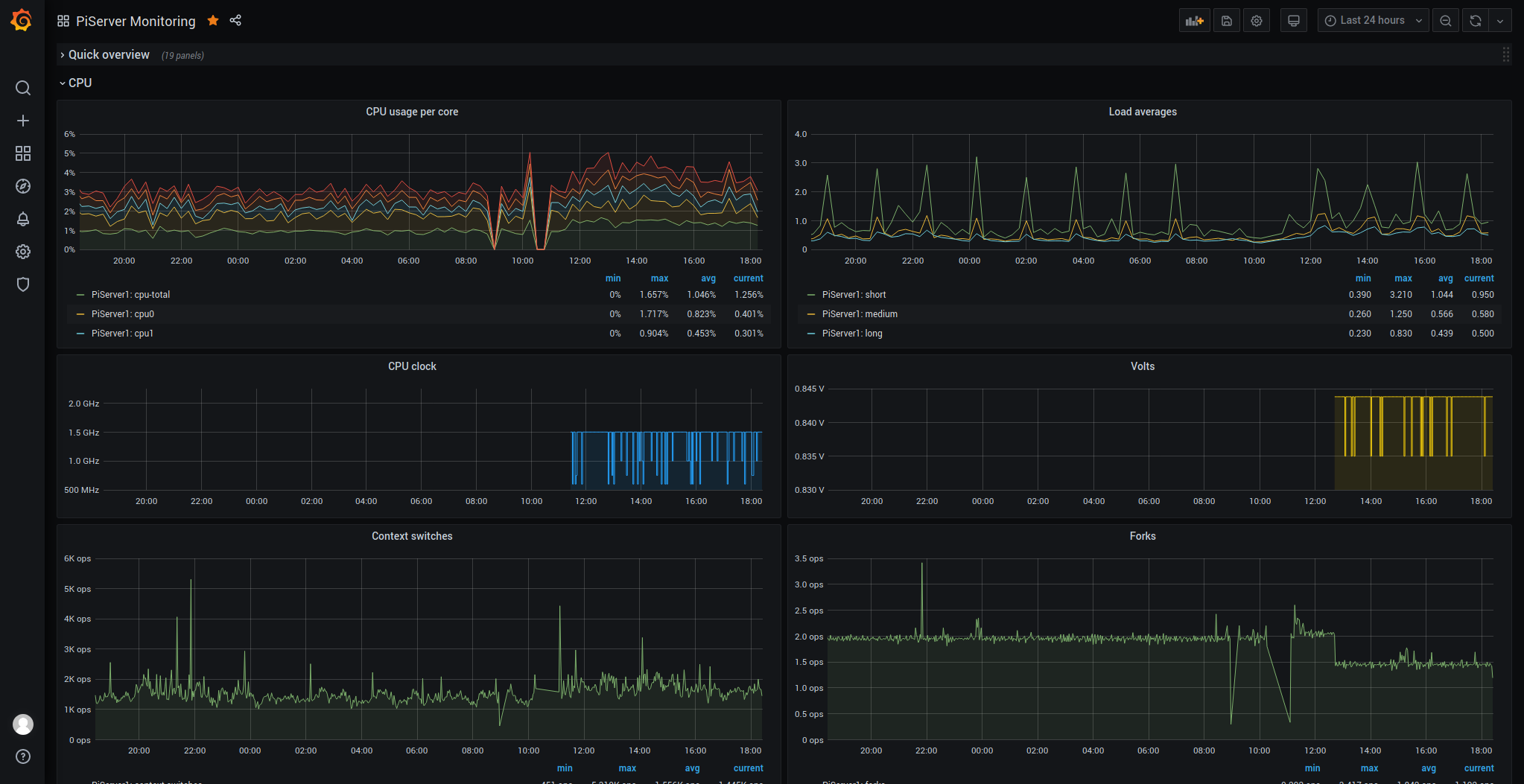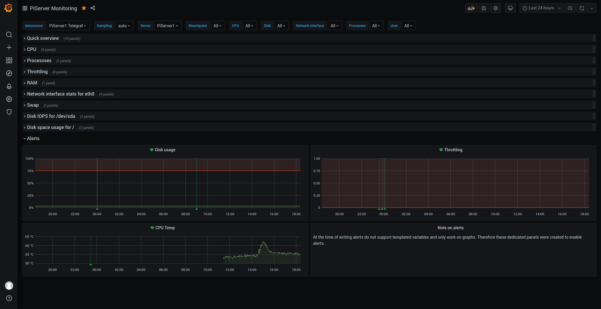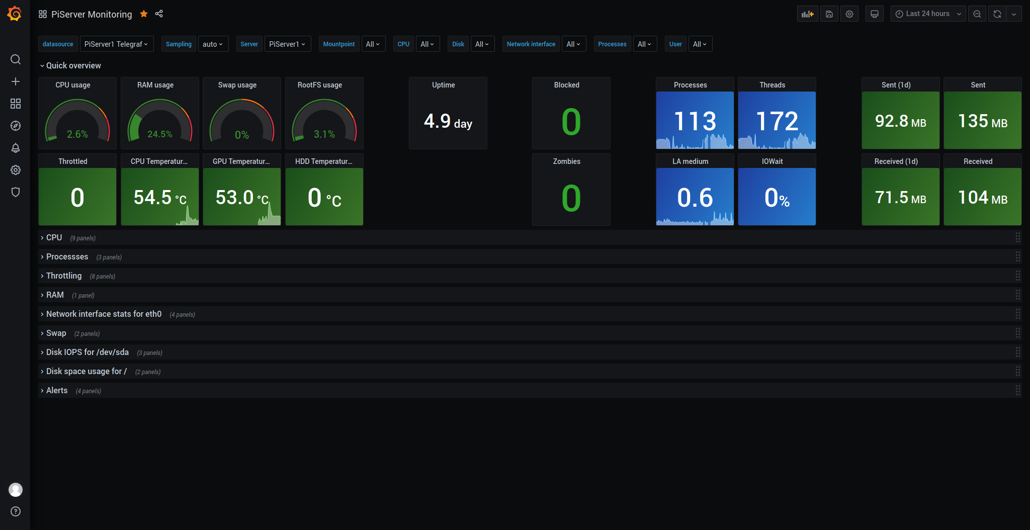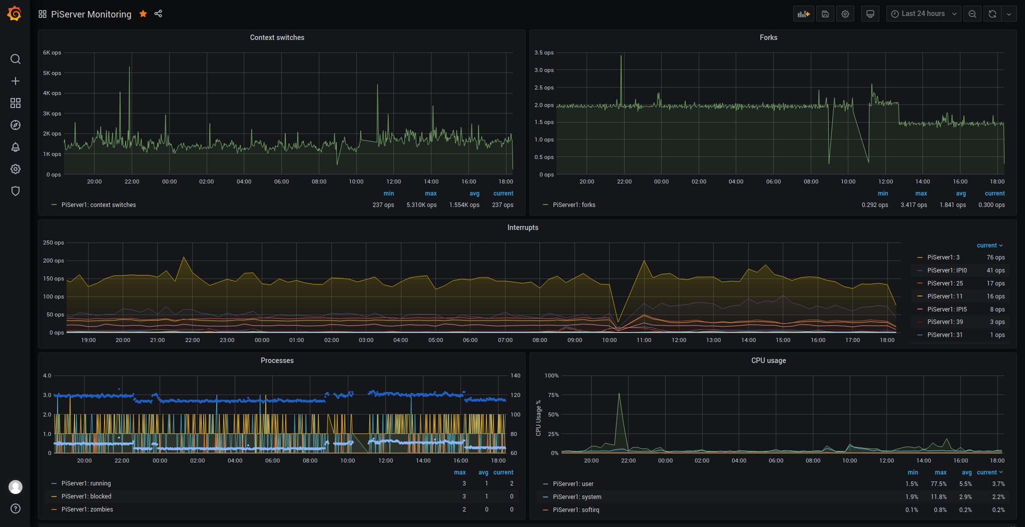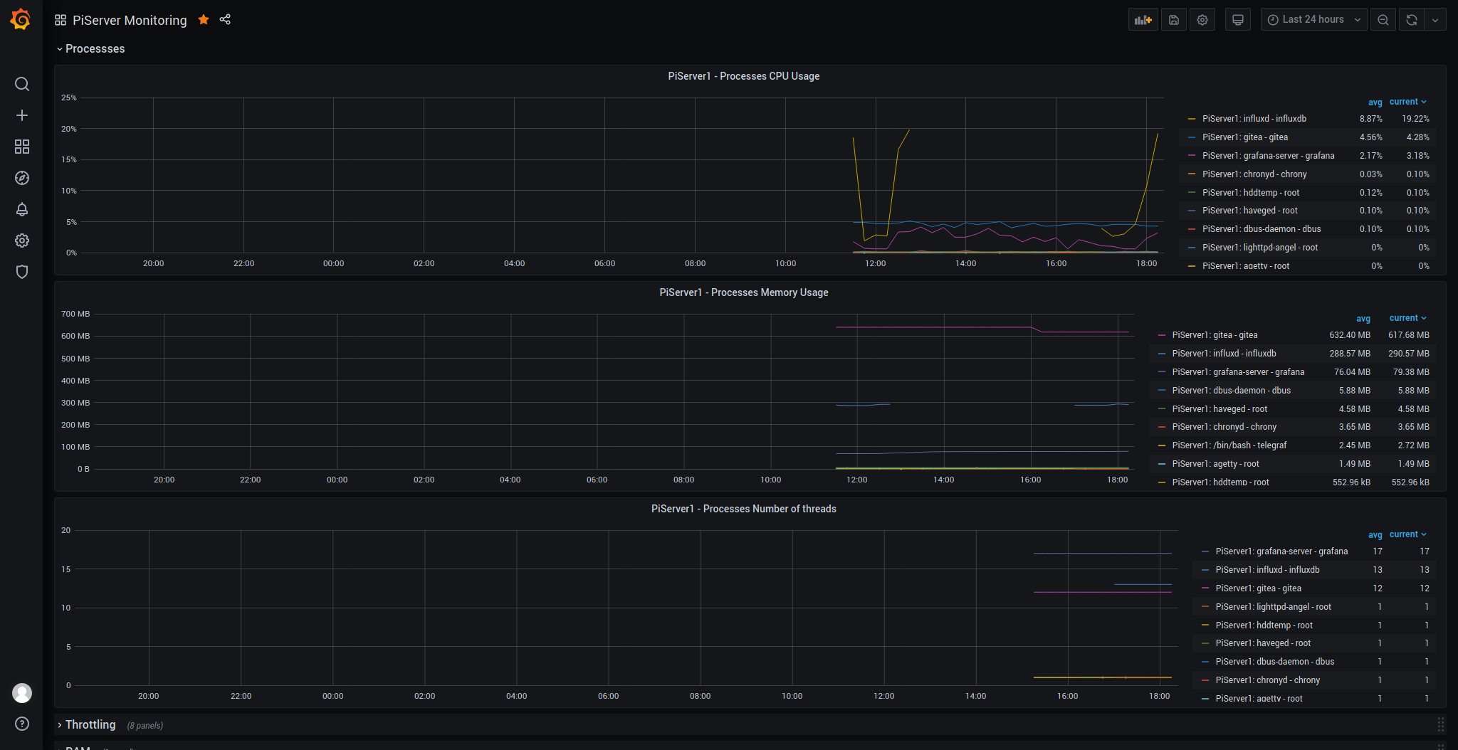 This dashboard is based on the Raspberry Pi Monitoring, System and Linux OS Processes Metrics community dashboards.