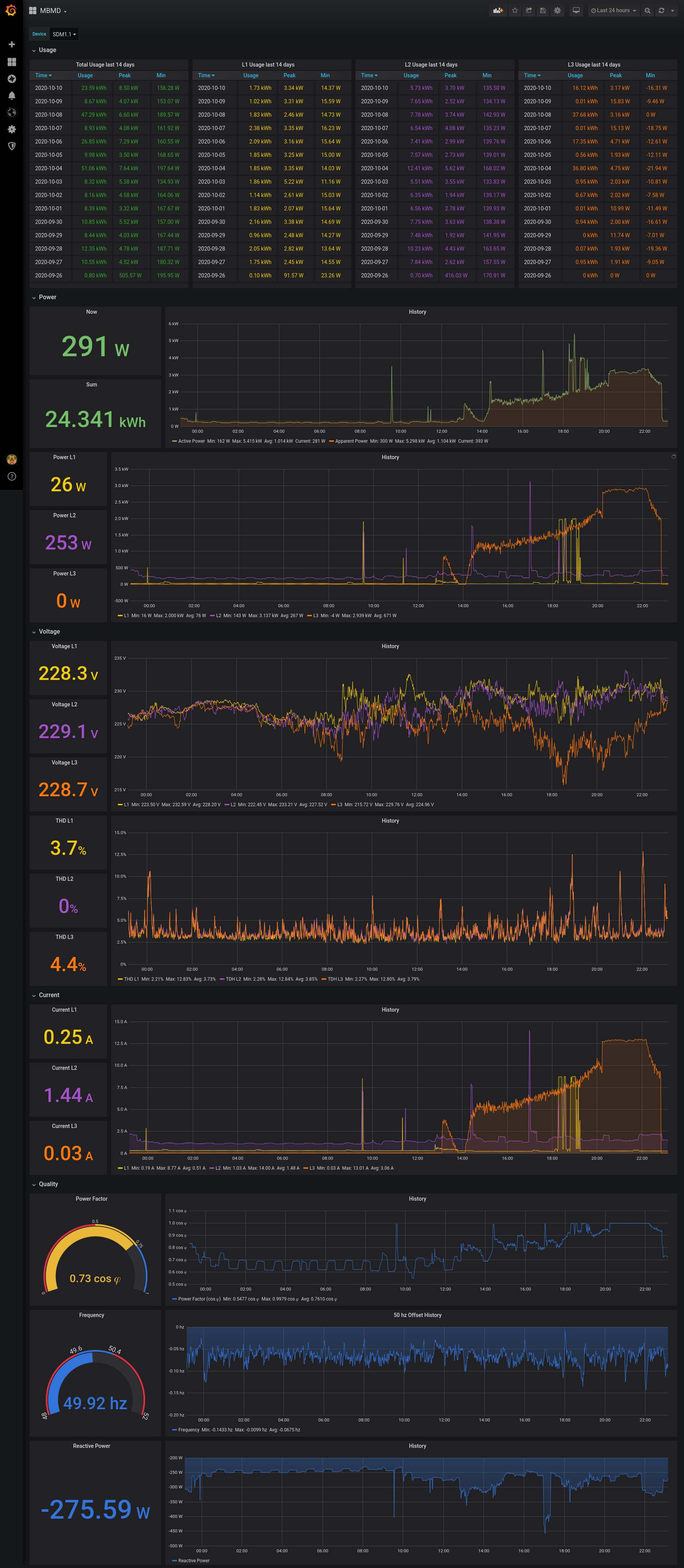 Dashboard showing key metrics from the ModBus Measurement Daemon (MBMD) https://github.com/volkszaehler/mbmd