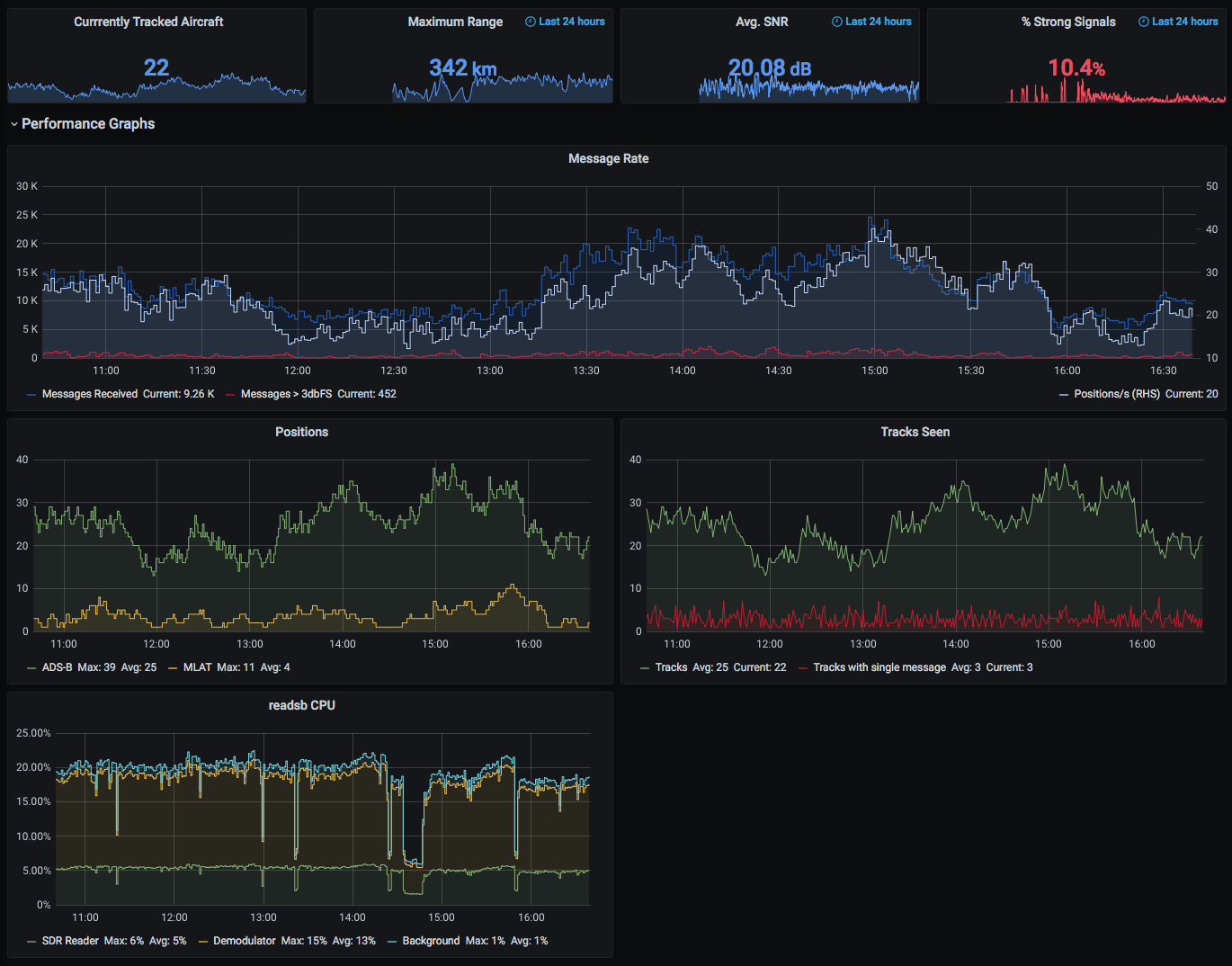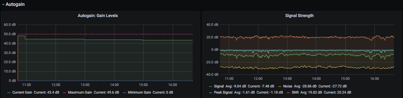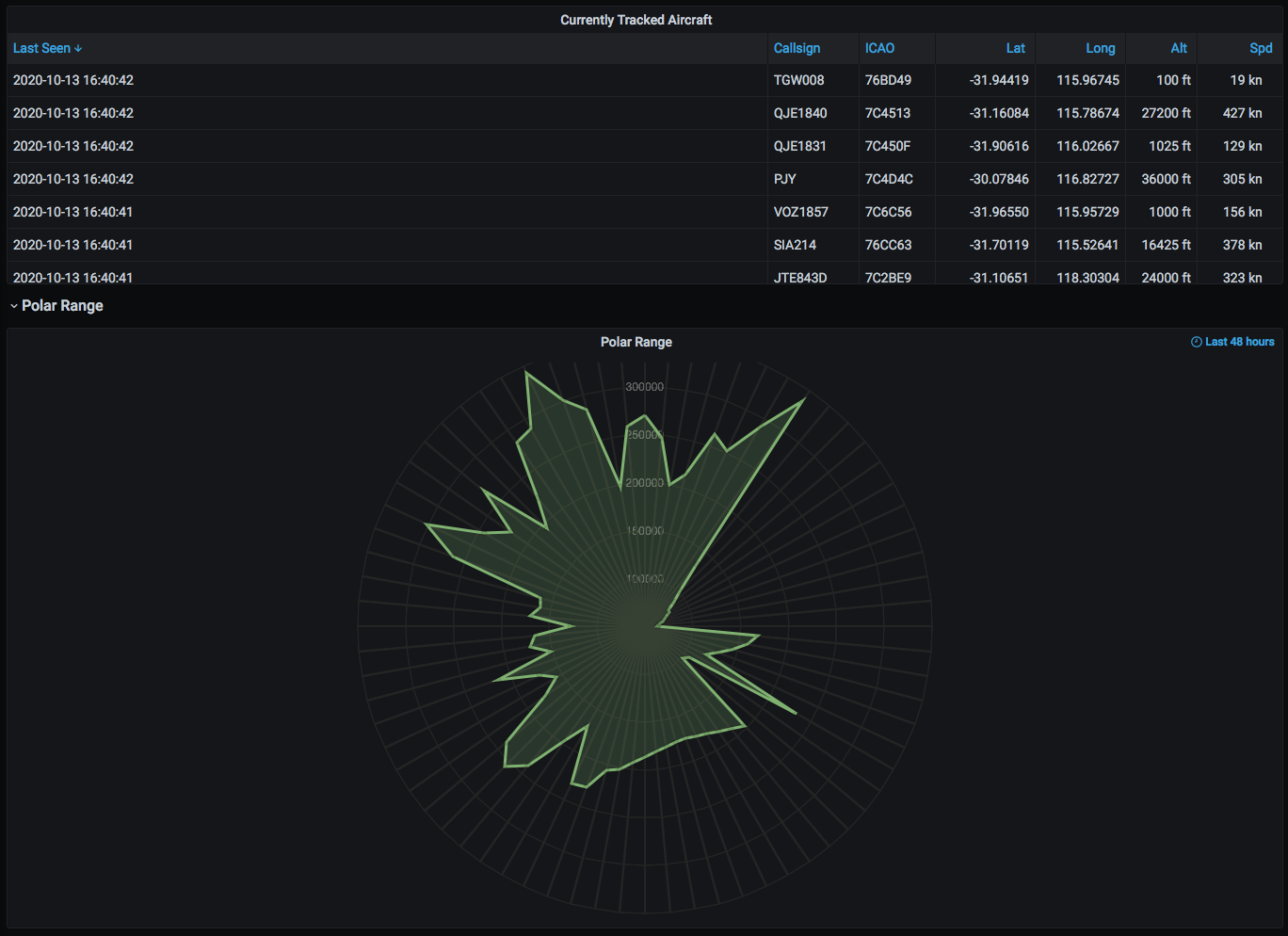 This dashboard aims to emulate the majority of the functionality of graphs1090, but using InfluxDB and Grafana, as well as implement some additional cool features like a polar range plot and information about the autogain system present in the container.