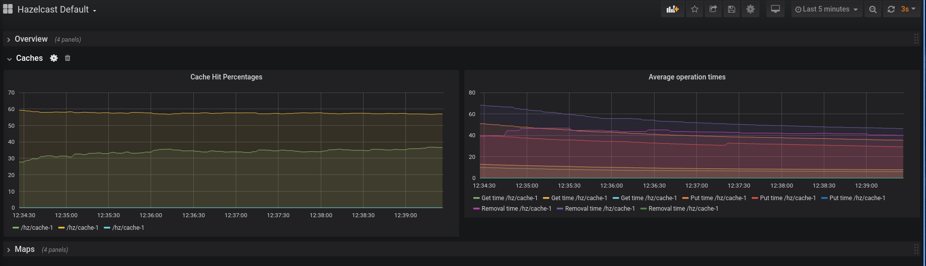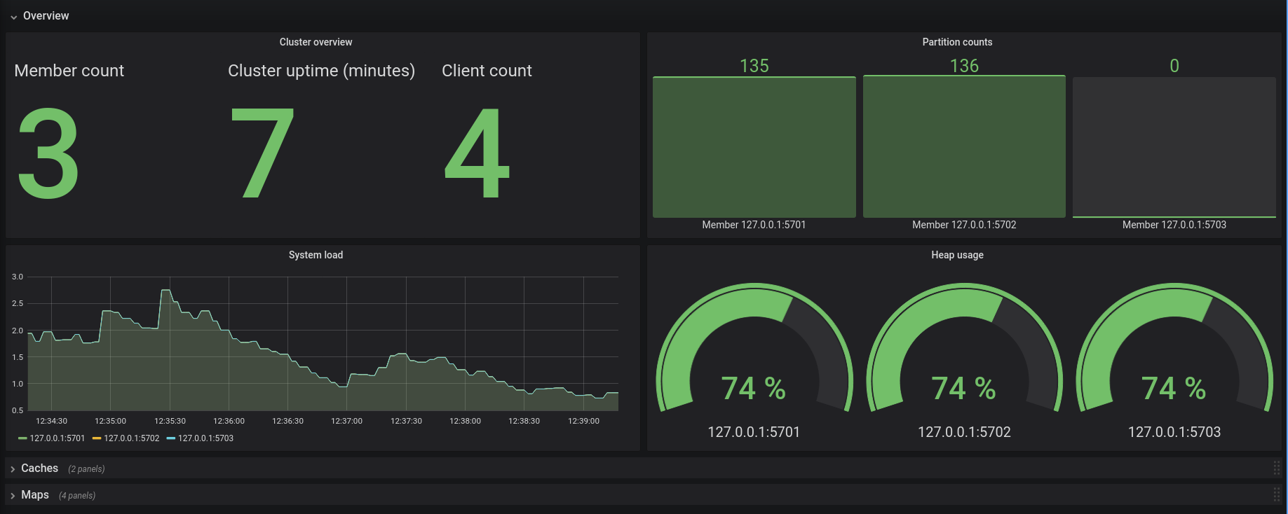 This dashboard visualizes common metrics received from a Prometheus instance which is connected to a Hazelcast Management Center instance. It displays general cluster information, and includes detail rows about IMaps and Caches.