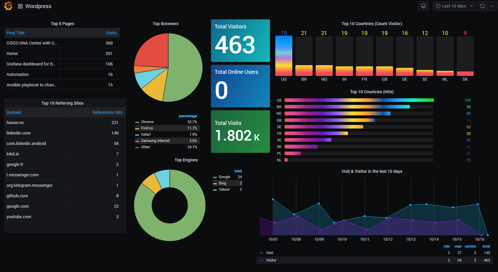 For more details visit: https://hawar.no/2020/10/wordpress-statistics-dashboard-in-grafana/