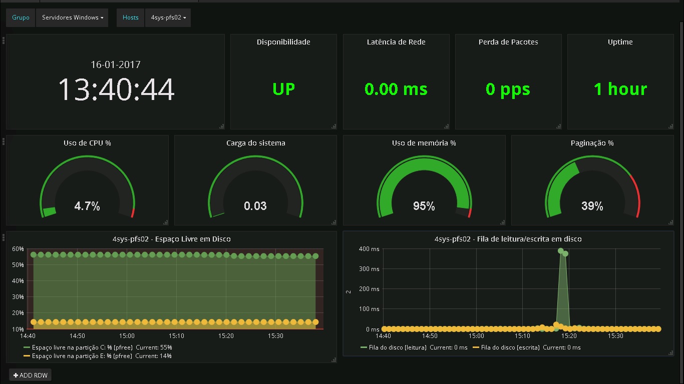 Dashboard baseado em informações coletadas em ambiente Windows; Neste Dashboard, criei um Templating, onde através do Grupo selecionado é possível alterar os hosts e obter informações automáticas.