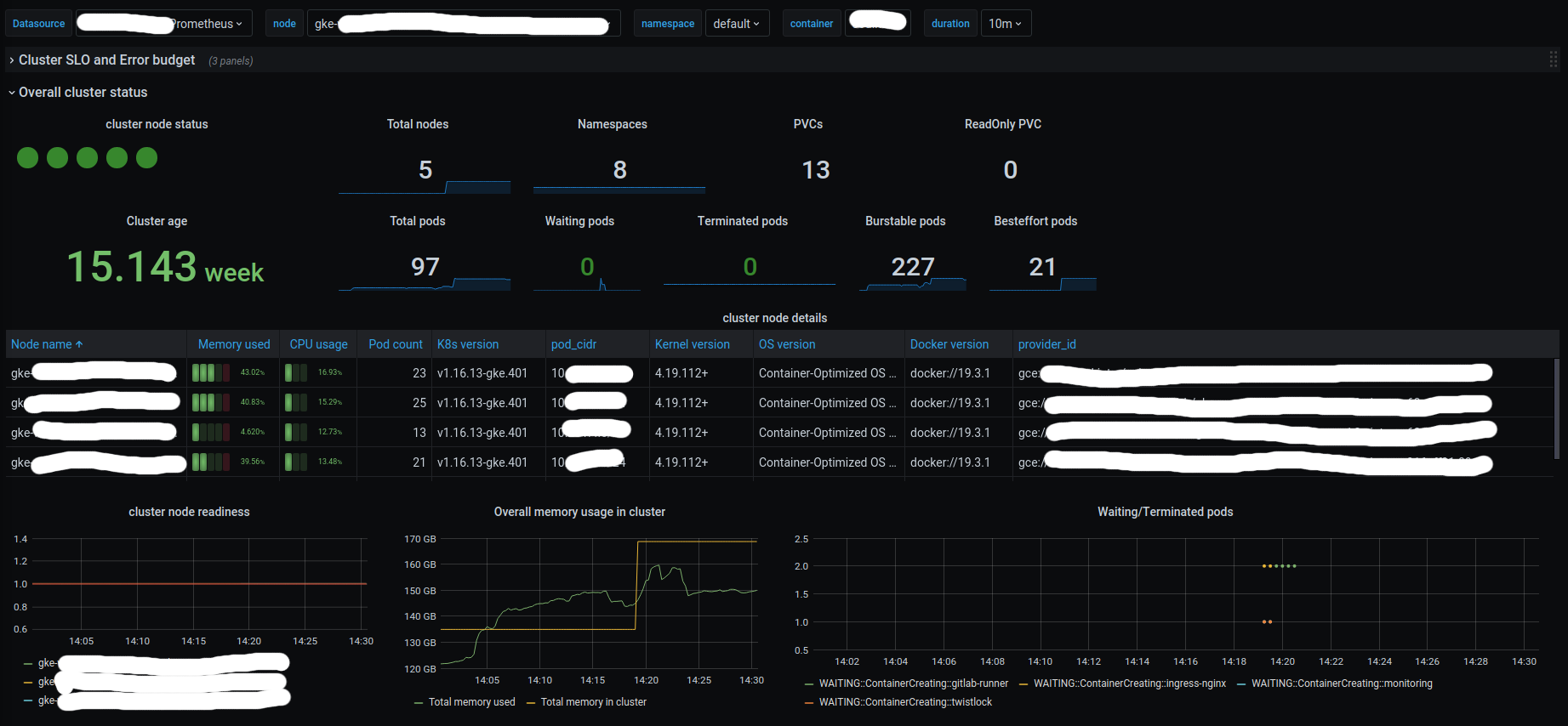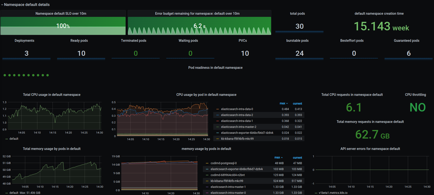 This dashboard can help to troubleshoot issues in Kubernetes cluster at cluster, node and namespace level. Calculate SLO and Error Budget without cronjob pod (pod name contains cronjob).