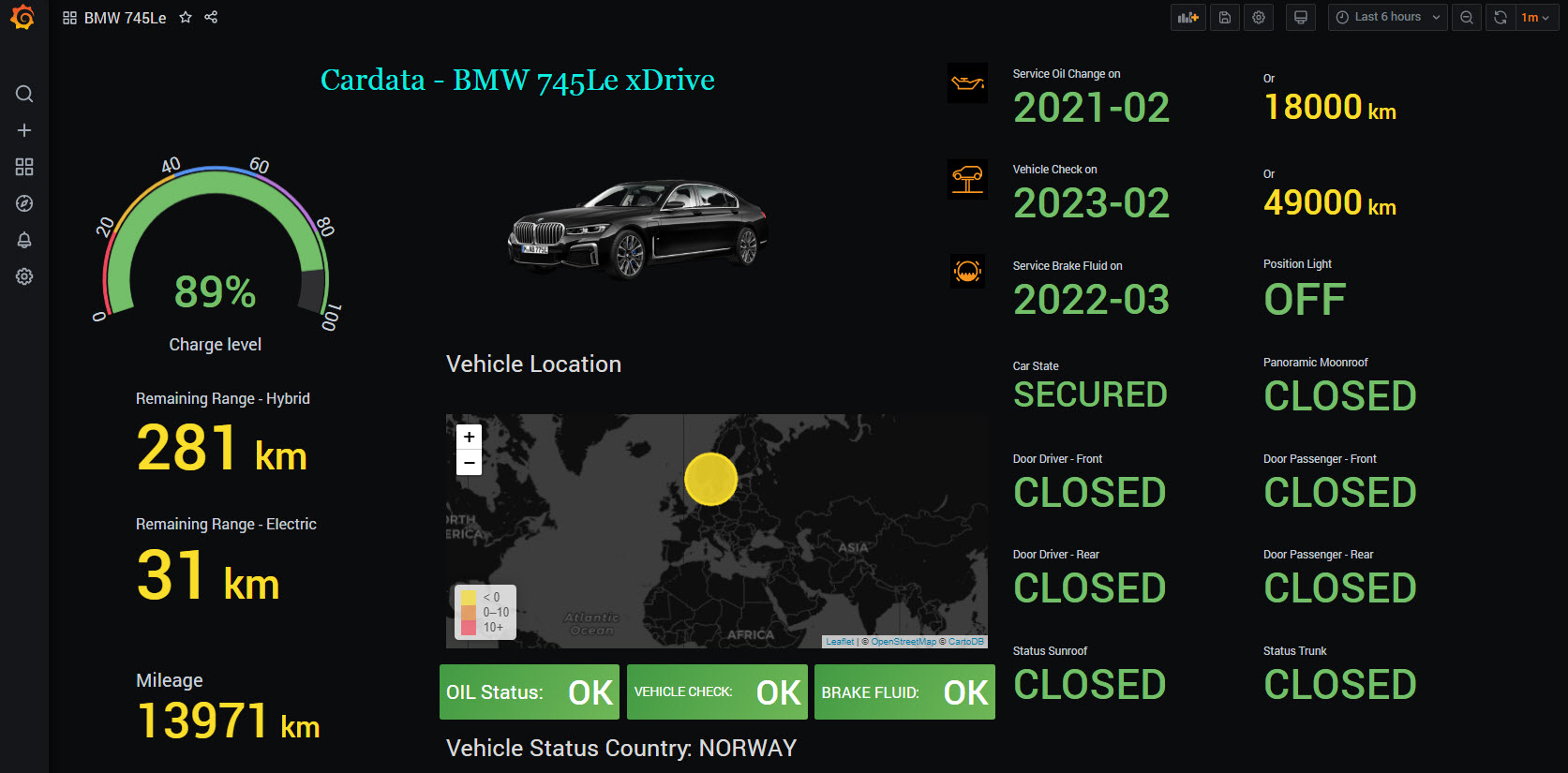 There are many companies that offer cars to their employees on a daily work. So maybe it's a good idea to have vehicle data on the Grafana Labs dashboard. This way you can query and control the status vehicle. Exemple. the vehicle's is locked, secured, brake fluid, oil and checks if the vehicle's status is OK. In addition, there are other details about the remaining range-hybrid and electric and much more... So far I have made a test #Grafana #dashboard for my vehicle #745Le. So my solution only works with #BMW (and #MINI) vehicles with a Connected Drive Account.