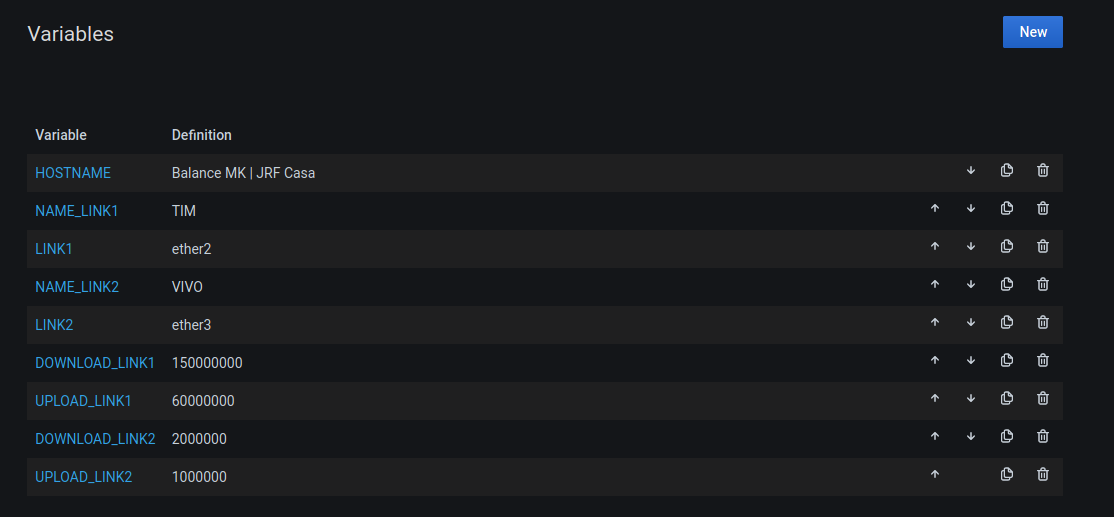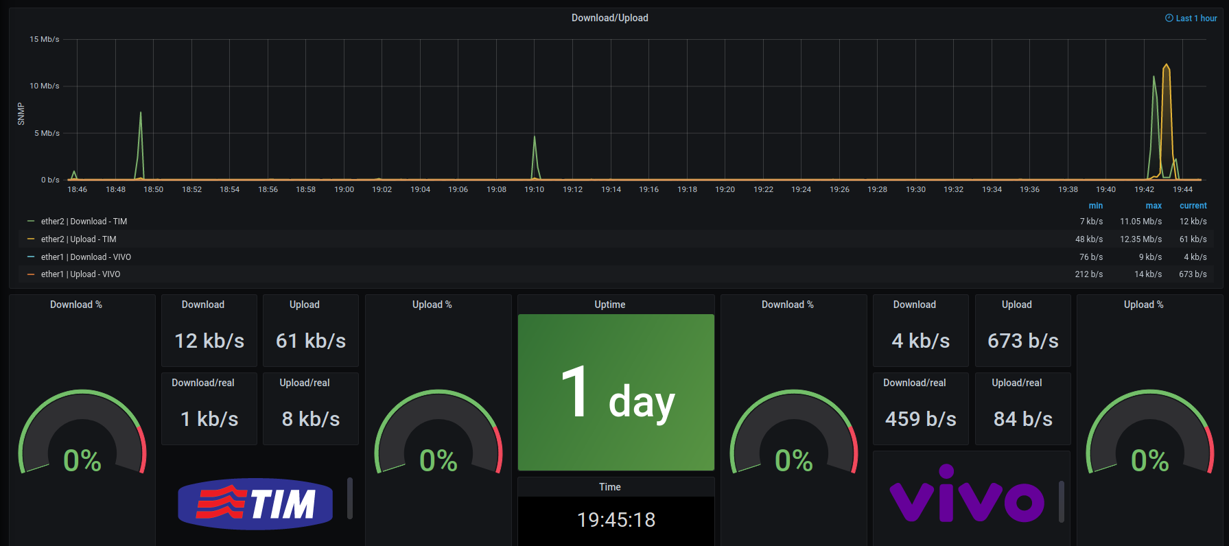 The Monitoramento de balance Mikrotik - SNMP dashboard uses the influxdb data source to create a Grafana dashboard with the gauge, grafana-clock-panel, graph, singlestat, stat and text panels.