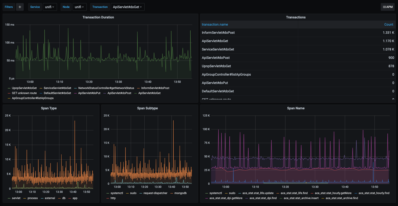 The Elasticsearch APM - Transactions dashboard uses the elasticsearch data source to create a Grafana dashboard with the graph and table panels.