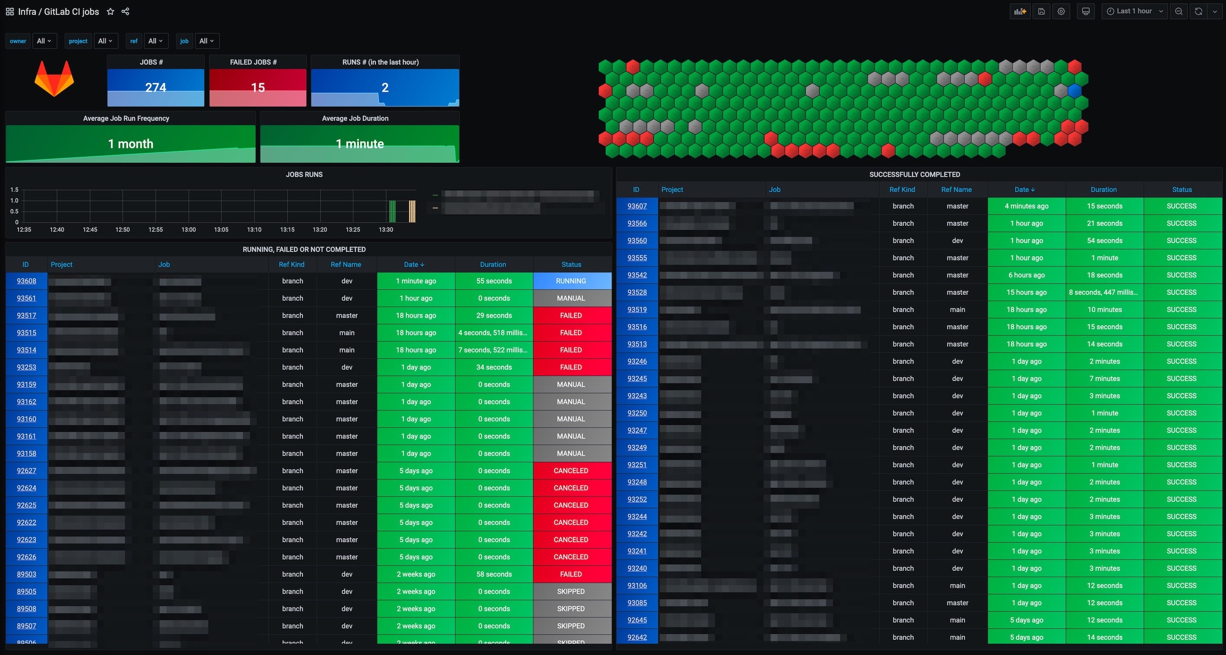 This dashboard leverages the Prometheus exporter I wrote to fetch information about GitLab CI pipelines statuses. More information here: https://github.com/mvisonneau/gitlab-ci-pipelines-exporter