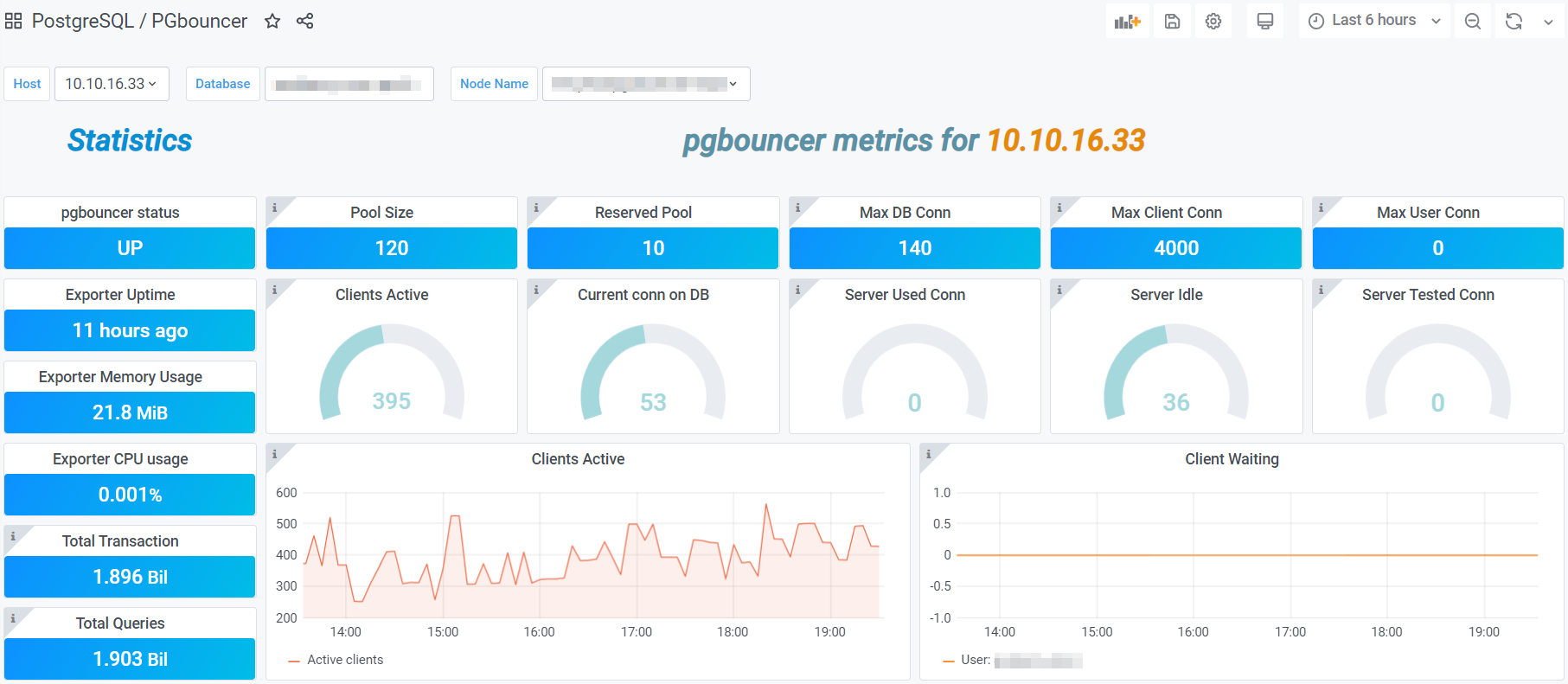 This dashboard works with the pgbouncer exporter and it has the graphs for all the metics. Make you are going to add the additional label called node_ip: your server ip. Because I have created the dashboard to work with node_ip or you can the dashboard JSON file and replace with node_name.