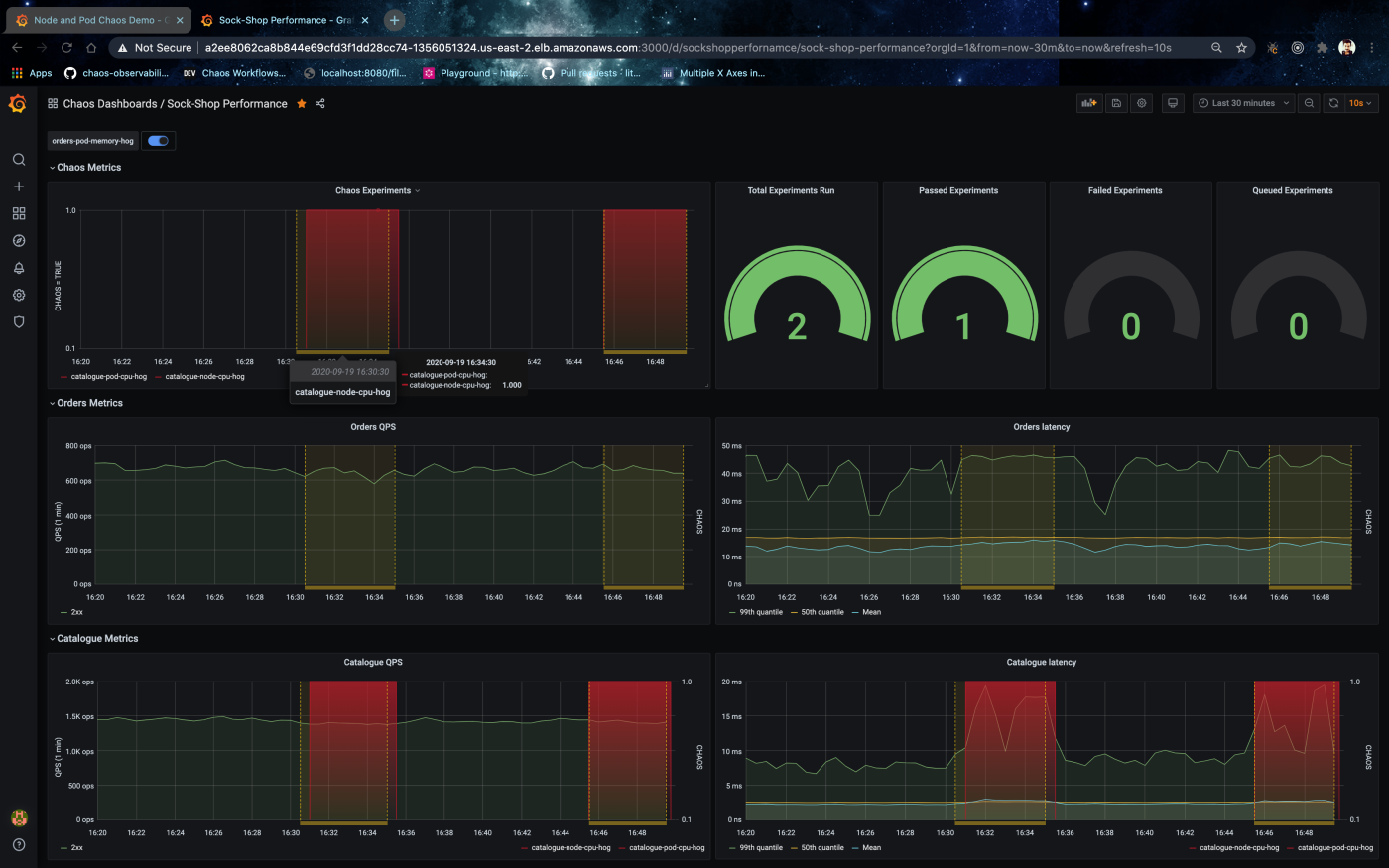 Monitor and visualise Sock Shop application metrics metrics interleaved with chaos events and chaos exporter metrics from LitmusChaos.
