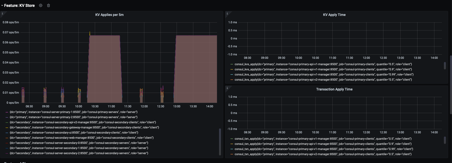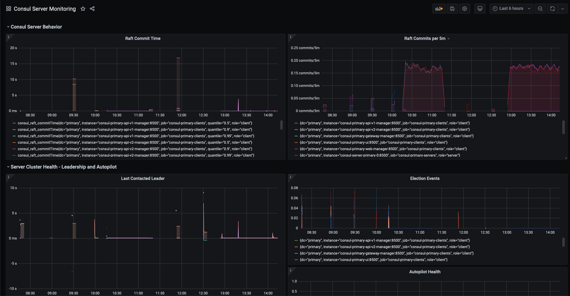 Due to Consul's architecture, some metrics are emitted on both server and client agents. Typical deploys have many more clients than servers running, which can add noise when monitoring Consul server health. To filter it down, we recommend adding labels in prometheus' scrape_config based on the consul's agent's role on the host. E.g. role="server" for Consul servers and role="client" for Consul client agents. This will allow you to adapt the panel queries to filter on role="server", showing only the timeseries emitted from servers. https://prometheus.io/docs/prometheus/latest/configuration/configuration/#scrape_config