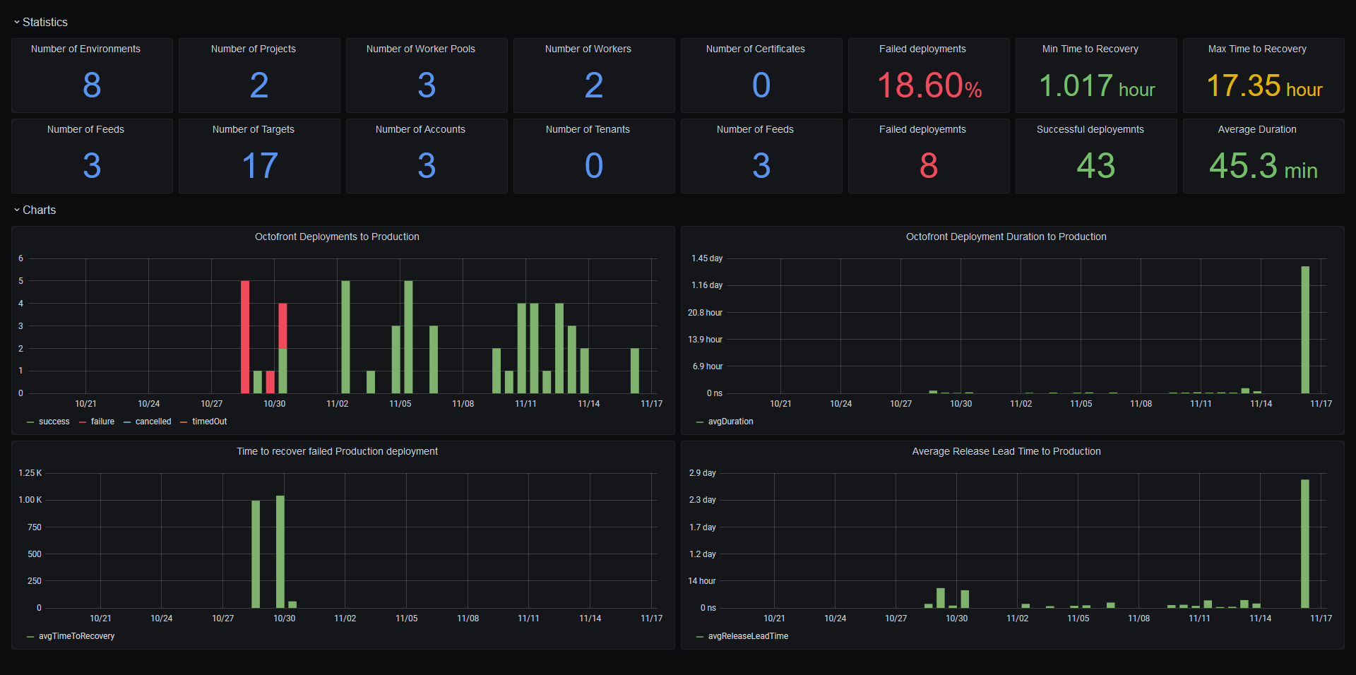 A sample dashboard displaying an overview of deployments for an Octopus project in a single environment.