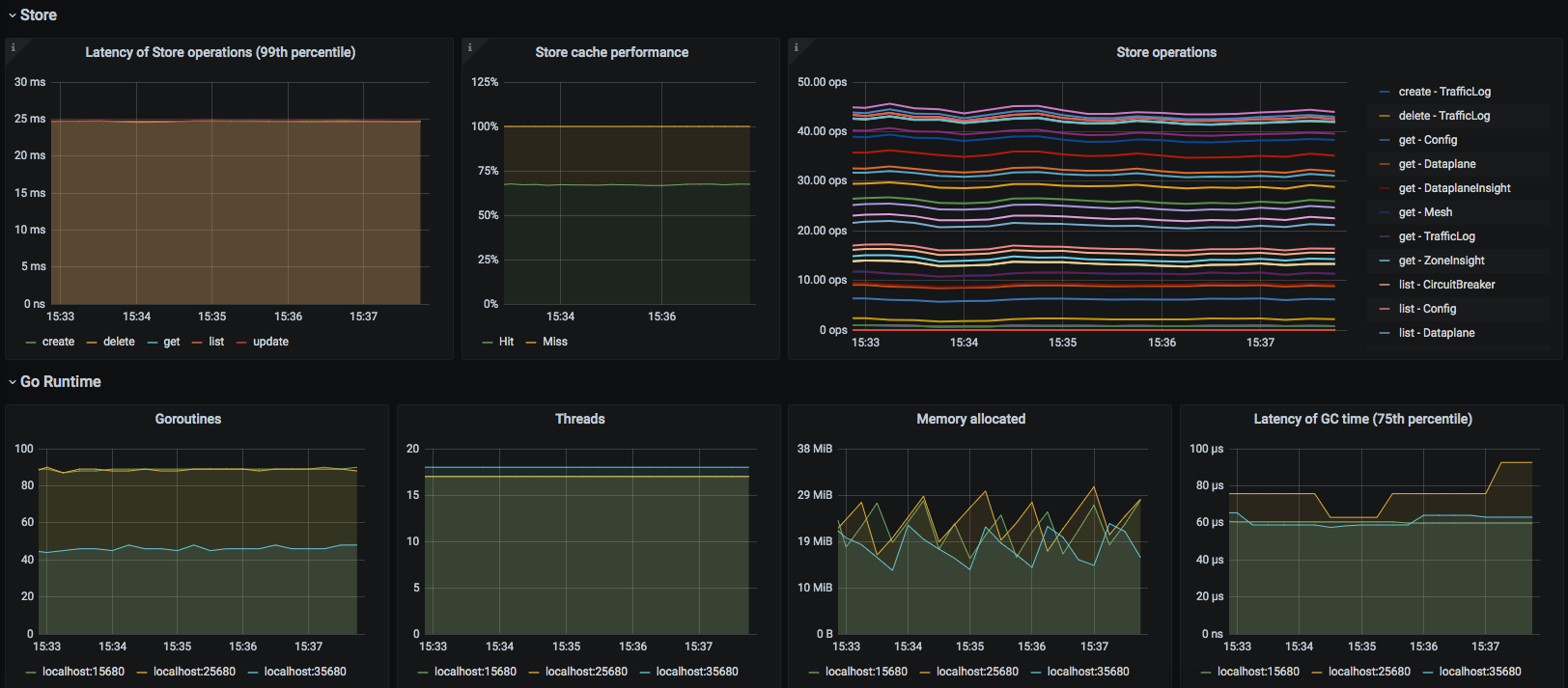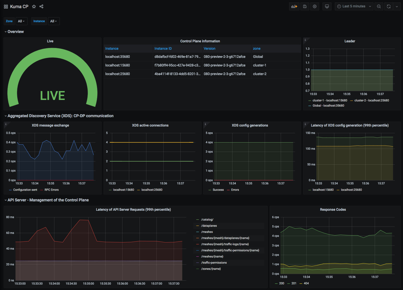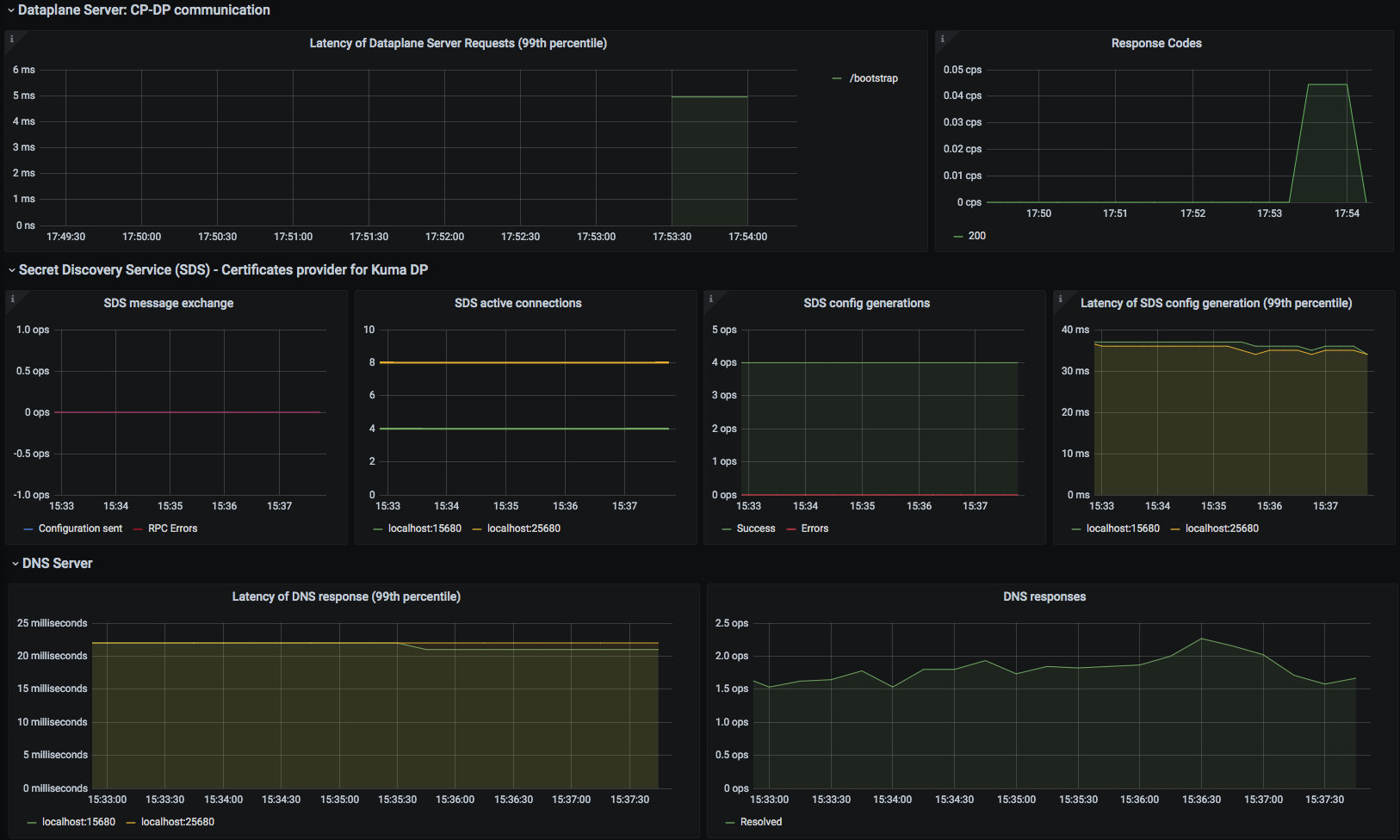 The Kuma CP dashboard uses the prometheus data source to create a Grafana dashboard with the graph, stat and table panels.