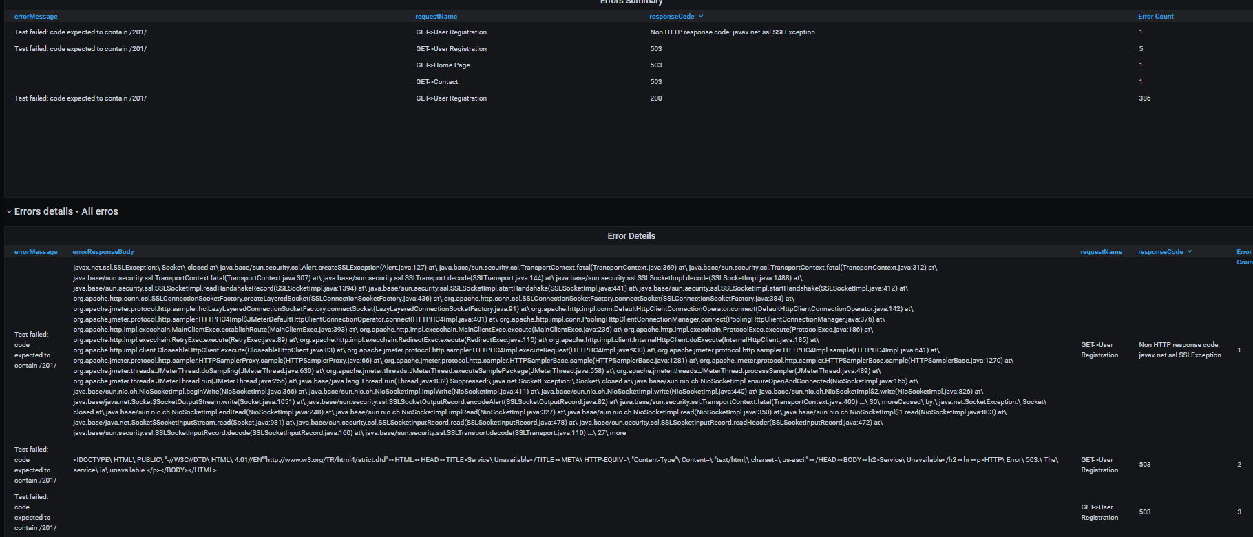 This dashboard requires Apache JMeter 5.3 or higher. It shows overall statistics, generates the transactions charts, aggregate report, latency, and errors overview.