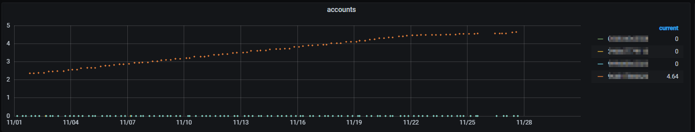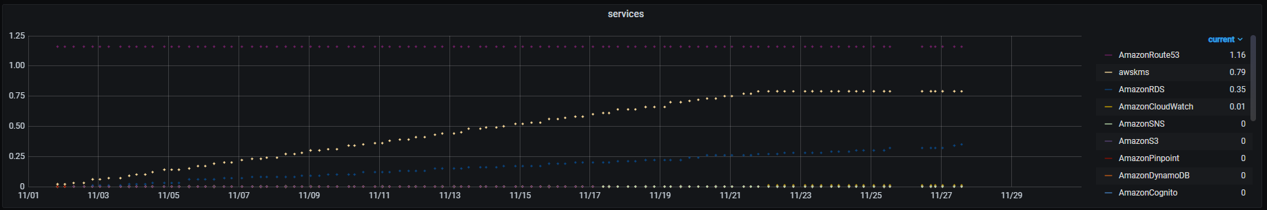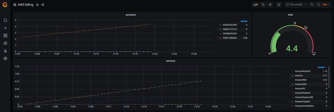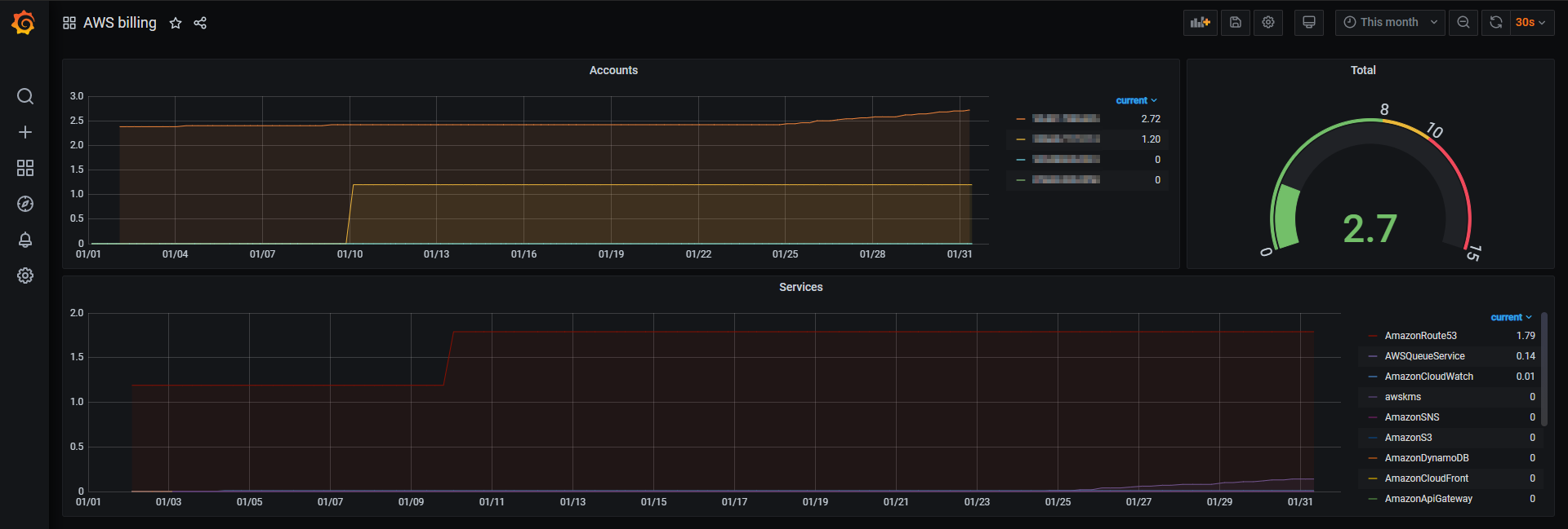 Billing dashboards with total costs as gauge and two graphs with metrics per account and service